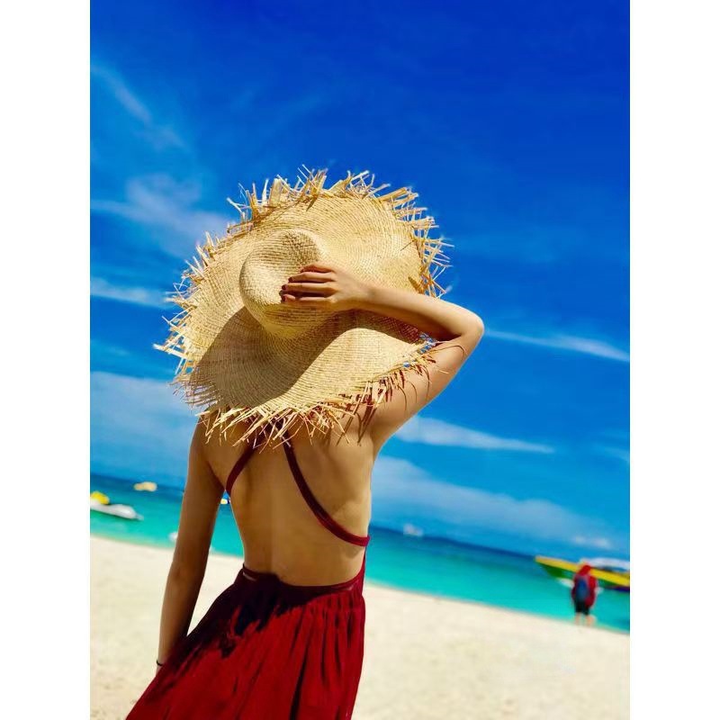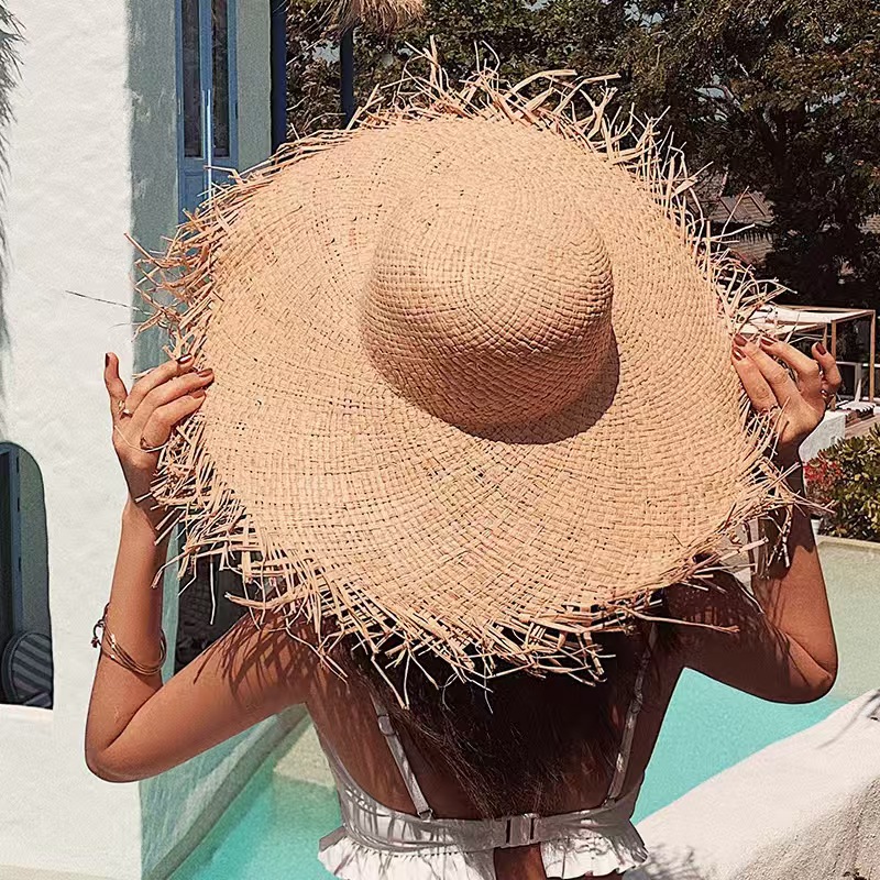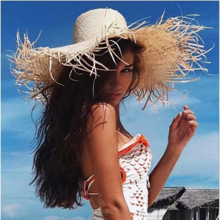 夏インスタイル大きなつばの生エッジラフィア麦わら帽子女性のビーチ帽子旅行海辺の休暇日焼け止め太陽の帽子