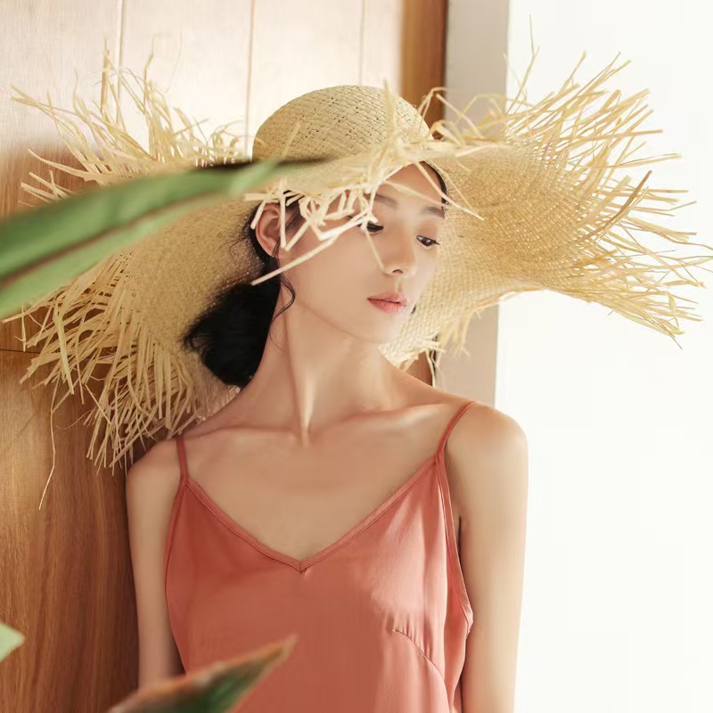夏のインスタ旅行リゾート風ラフィラの麦わら帽子の女性の大きなつばの日よけ日焼け止めの毛の縁の気質のビーチ帽