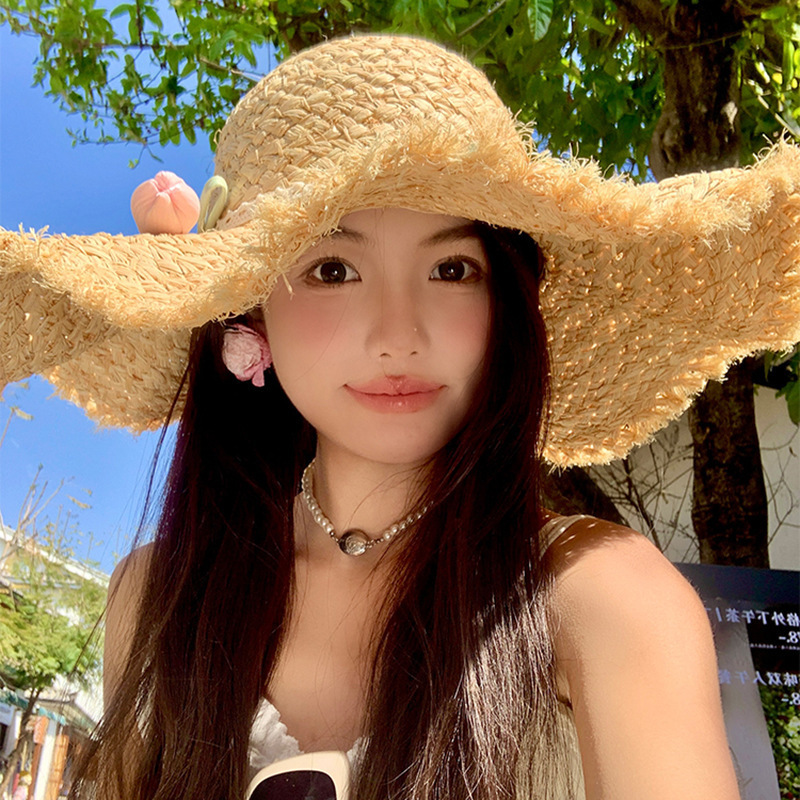 玫瑰花朵拉菲草帽女夏季超大帽檐草编遮阳防晒帽海边度假太阳帽子