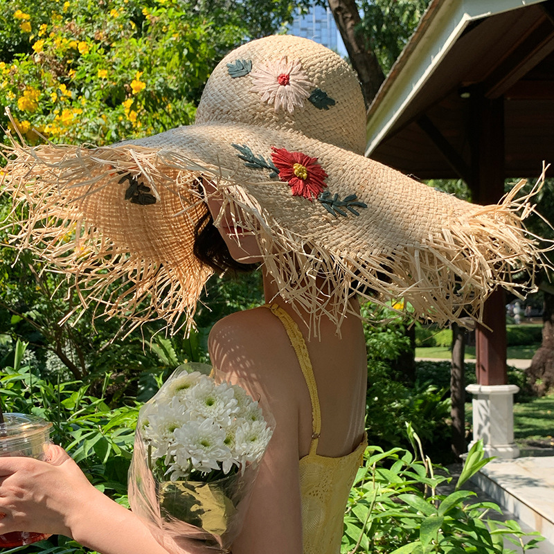 花朵刺绣手工编织拉菲草草帽女春夏海边度假遮阳防晒沙滩帽大帽檐