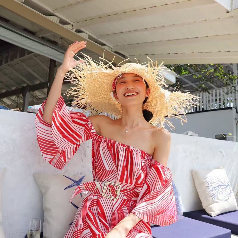 麦わら帽子の女性の日よけ日焼け止めの大きな軒ins小清新春夏にビーチで休暇を過ごす甘い森系百合顕
