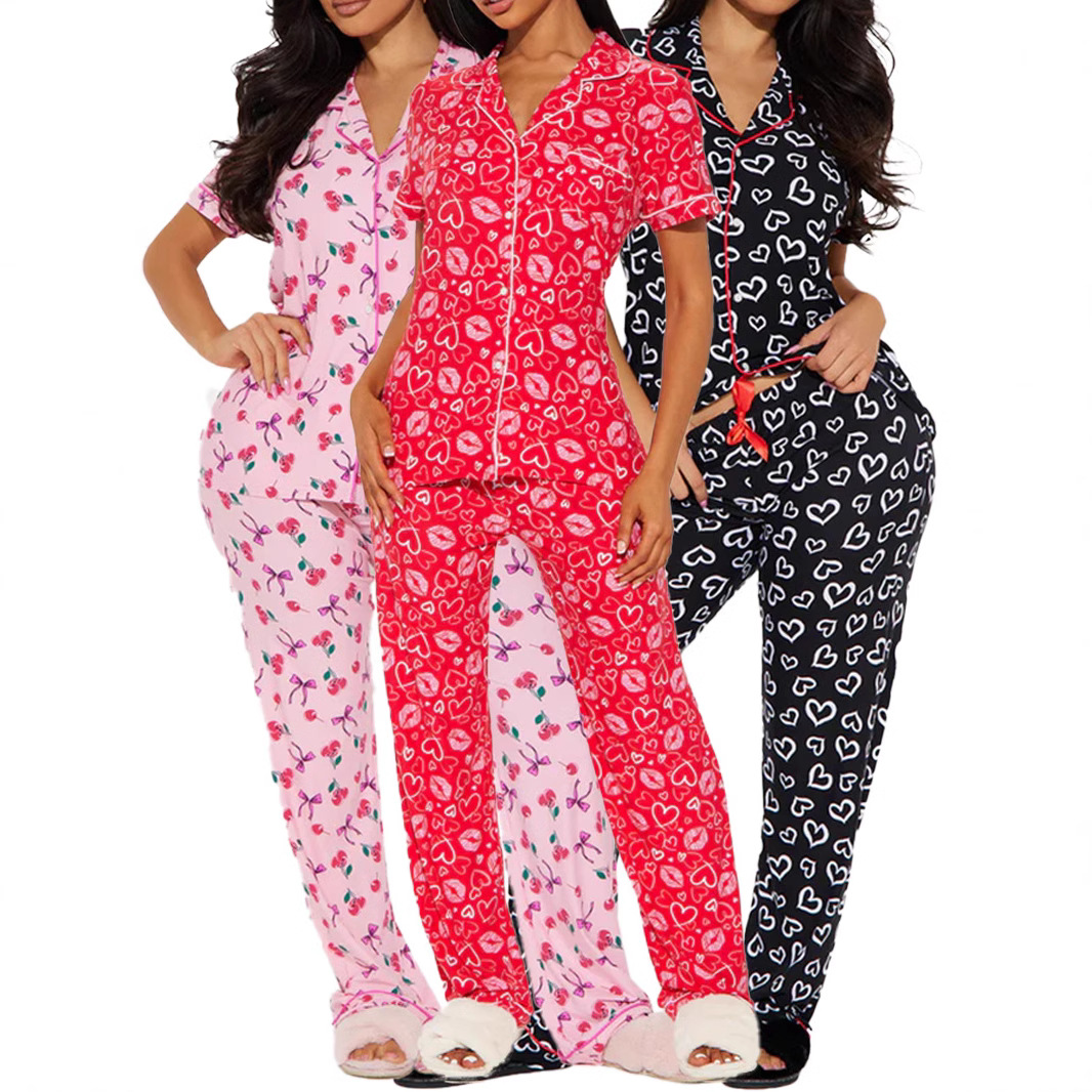 クロスボーダーヨーロッパサイズ 2025 ホームコンフォートプリント女性のフロントラペル半袖ズボンスーツモーダル