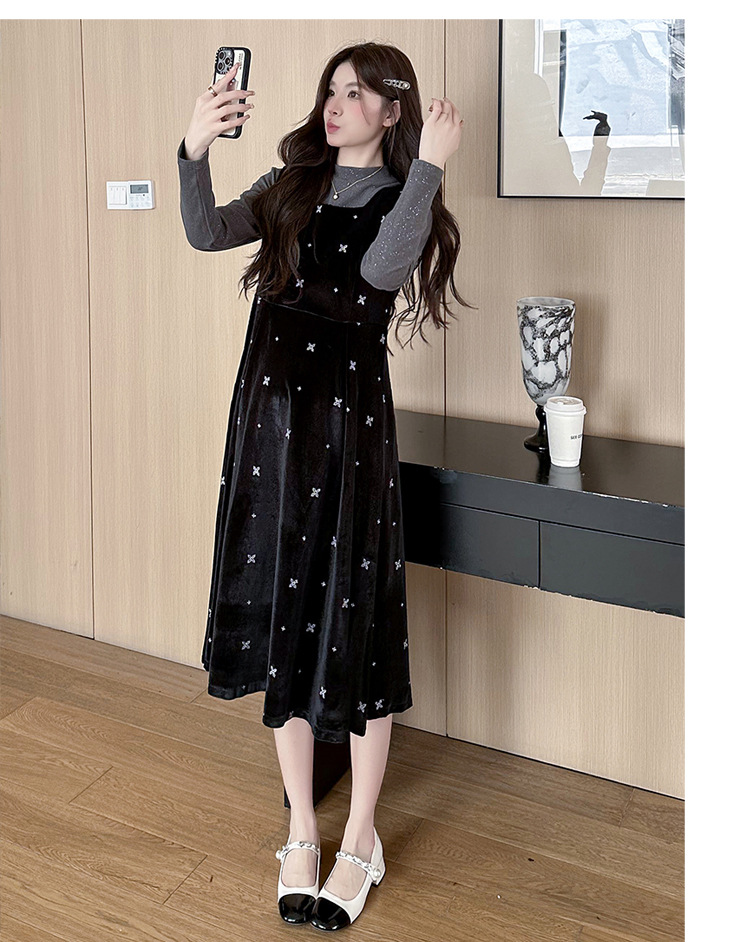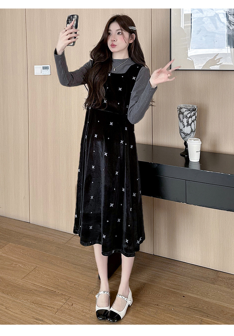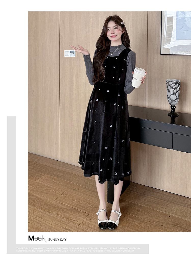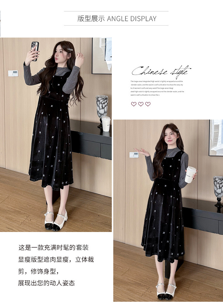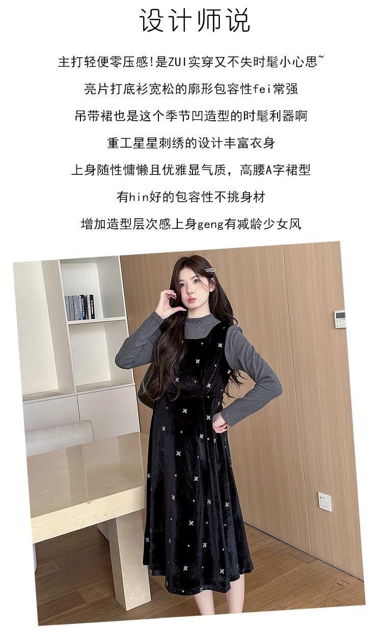 大码女装设计感背带连衣裙显瘦细闪雪花丝绒两件套装裙