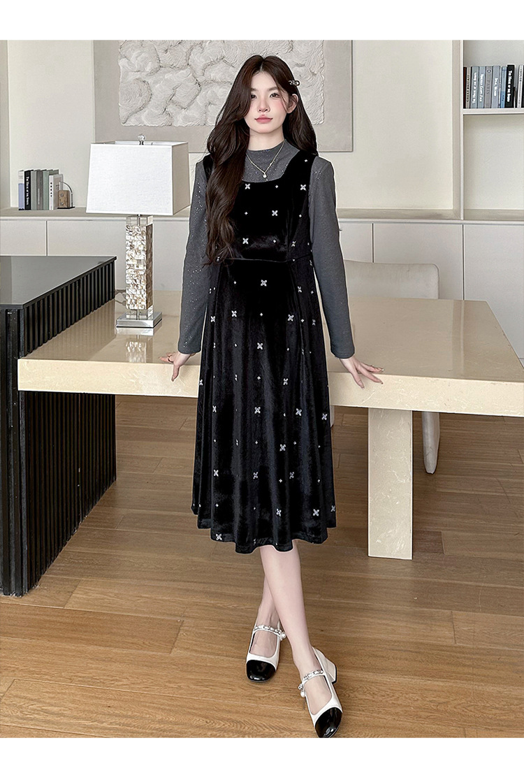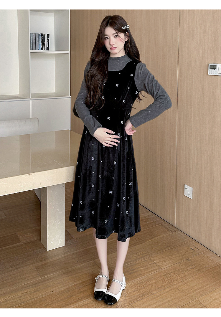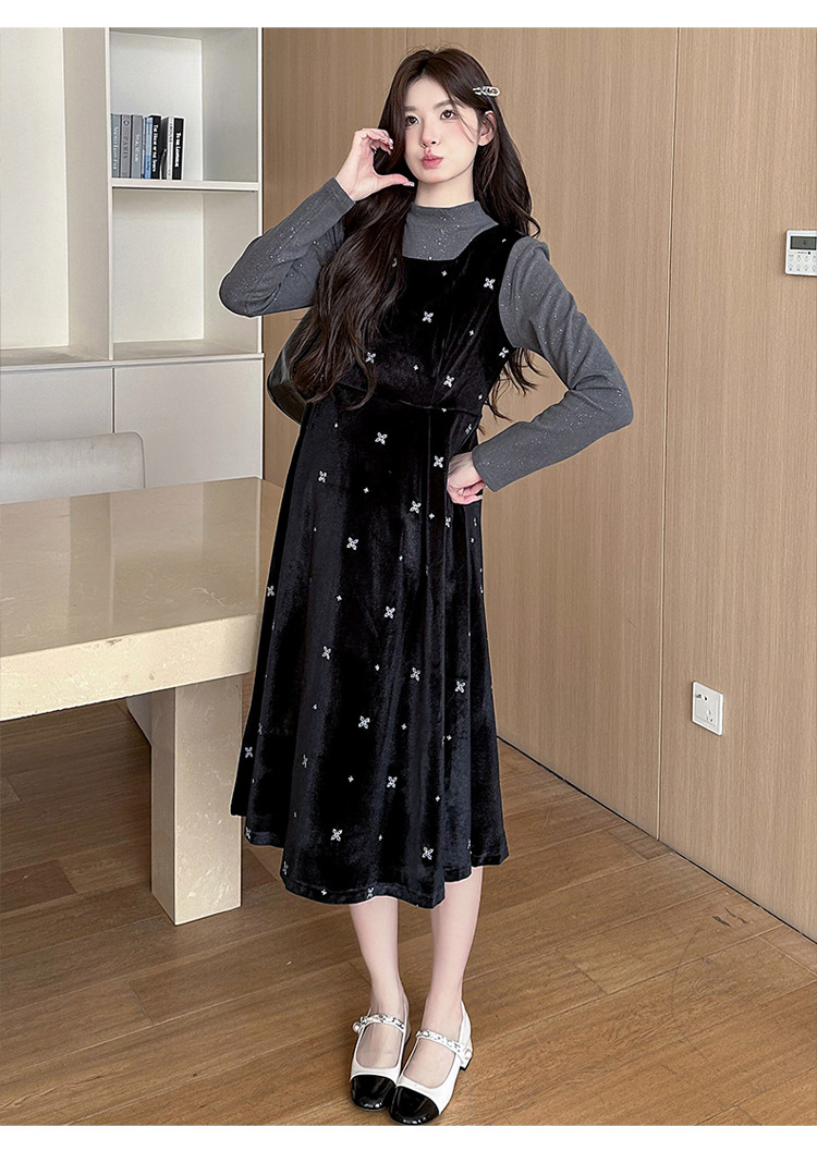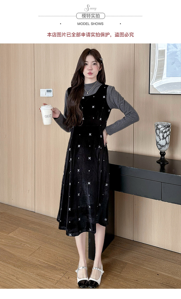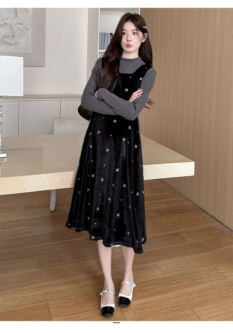 大码女装设计感背带连衣裙显瘦细闪雪花丝绒两件套装裙