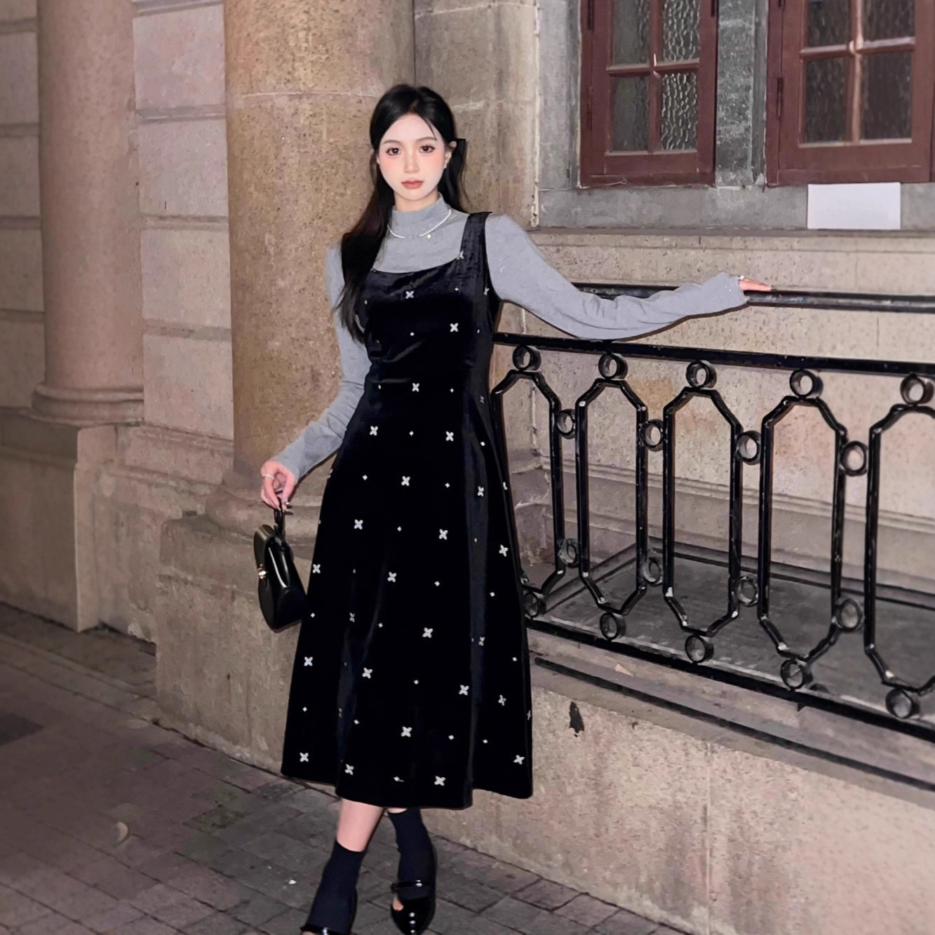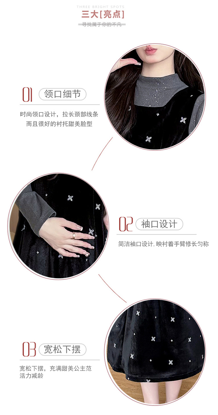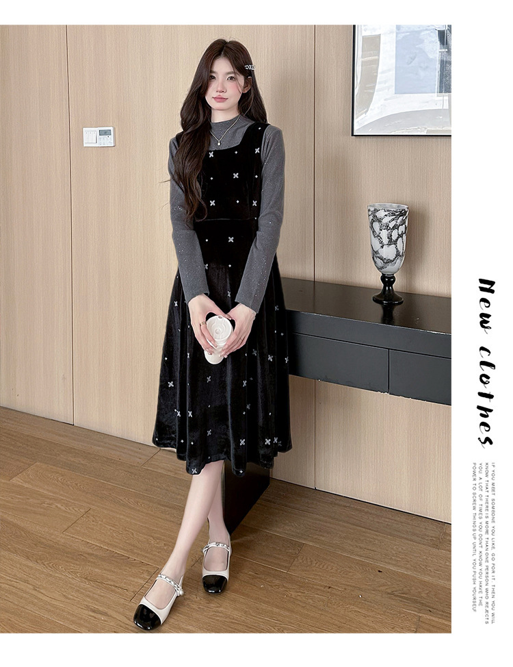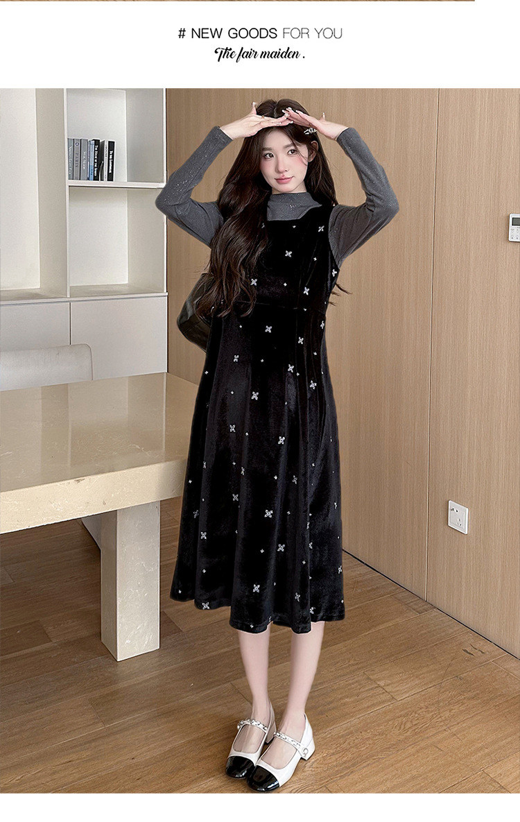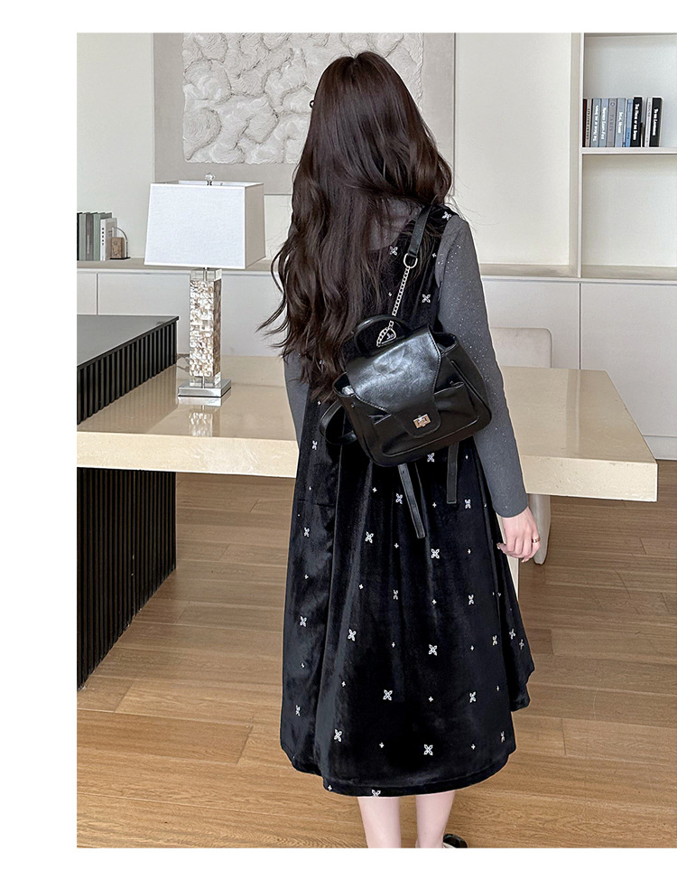 大码女装设计感背带连衣裙显瘦细闪雪花丝绒两件套装裙