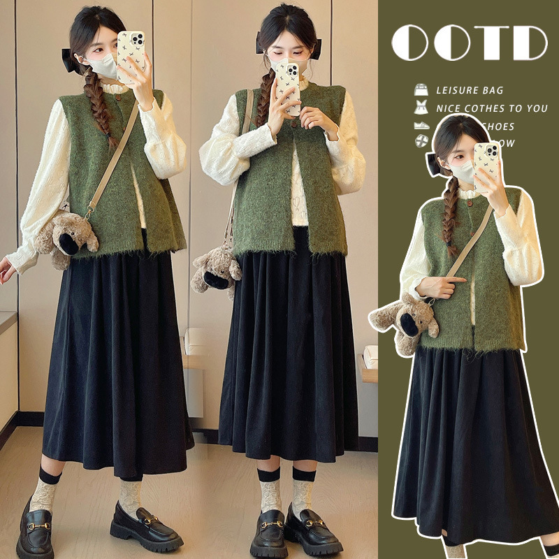 实拍 秋季显白毛衣马甲+打底衫+抽绳半身裙法式孕妈三件套装