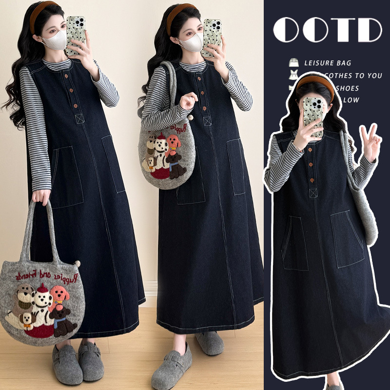 实拍 秋季百搭条纹上衣+韩版宽松休闲牛仔背心裙孕妇两件套装