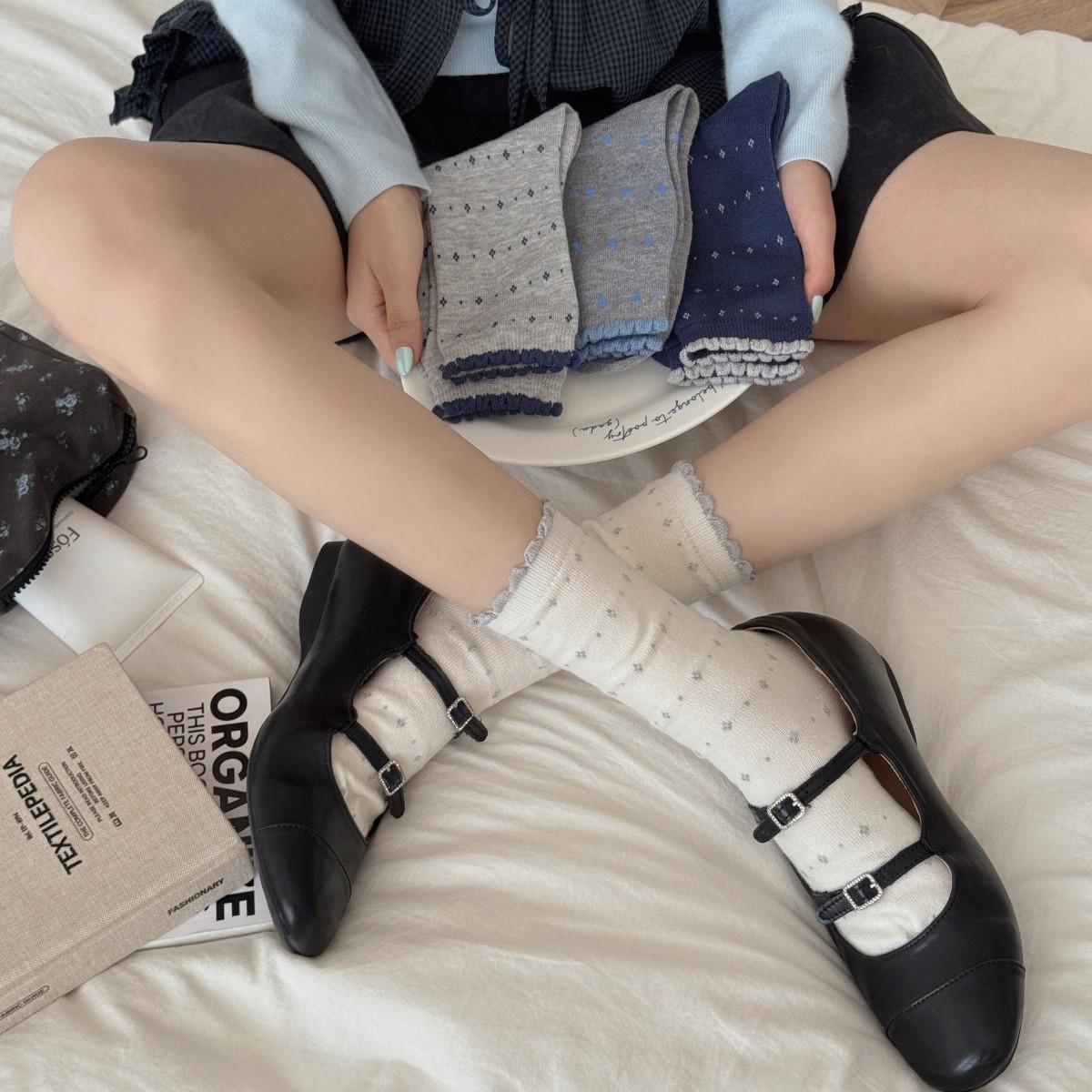 25年秋冬新款饰品袜子女蓝灰花边女士中筒袜ins风韩版长筒堆堆袜