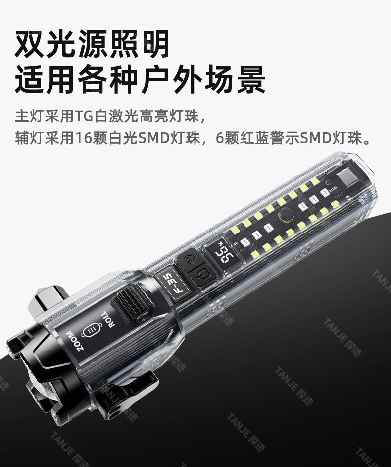 新型安全ハンマー白レーザー強光懐中電灯遠射屋外車載緊急ローラーズームダブル光源懐中電灯
