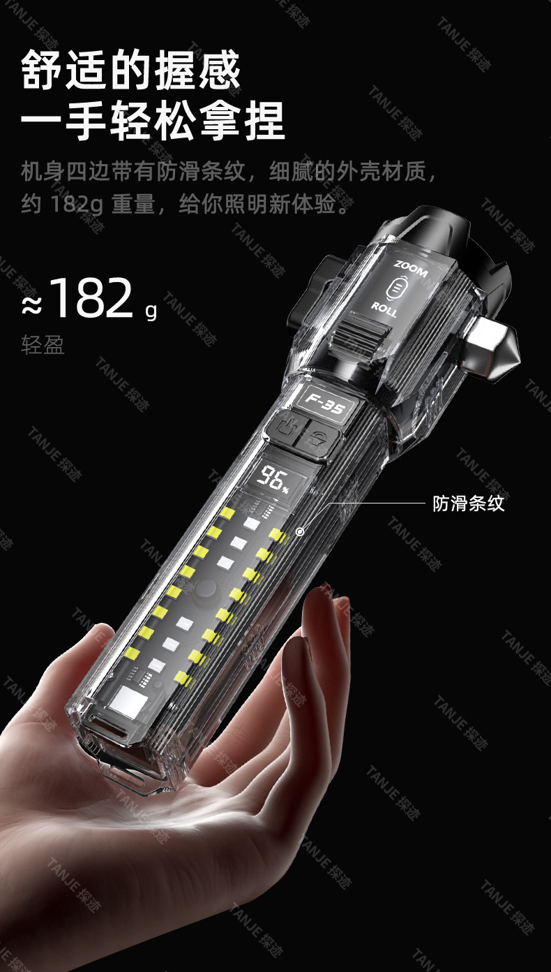 跨境新款带锤白激光手电筒多功能户外车载应急滚轮变焦多场景警报