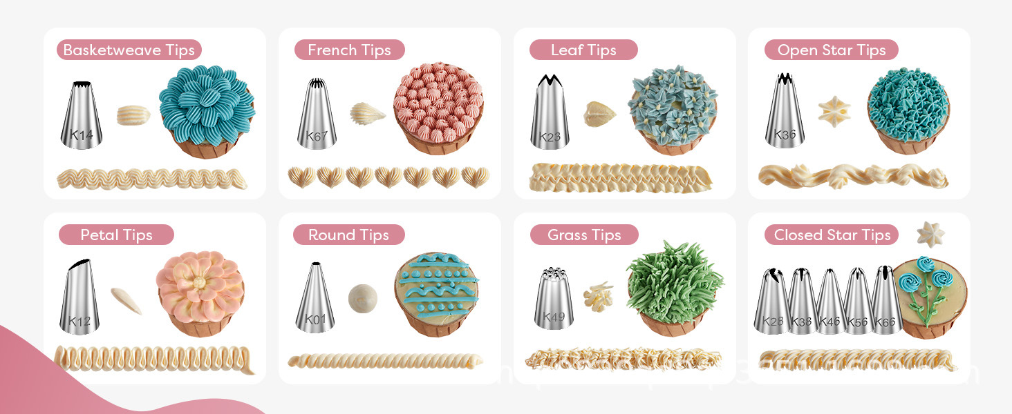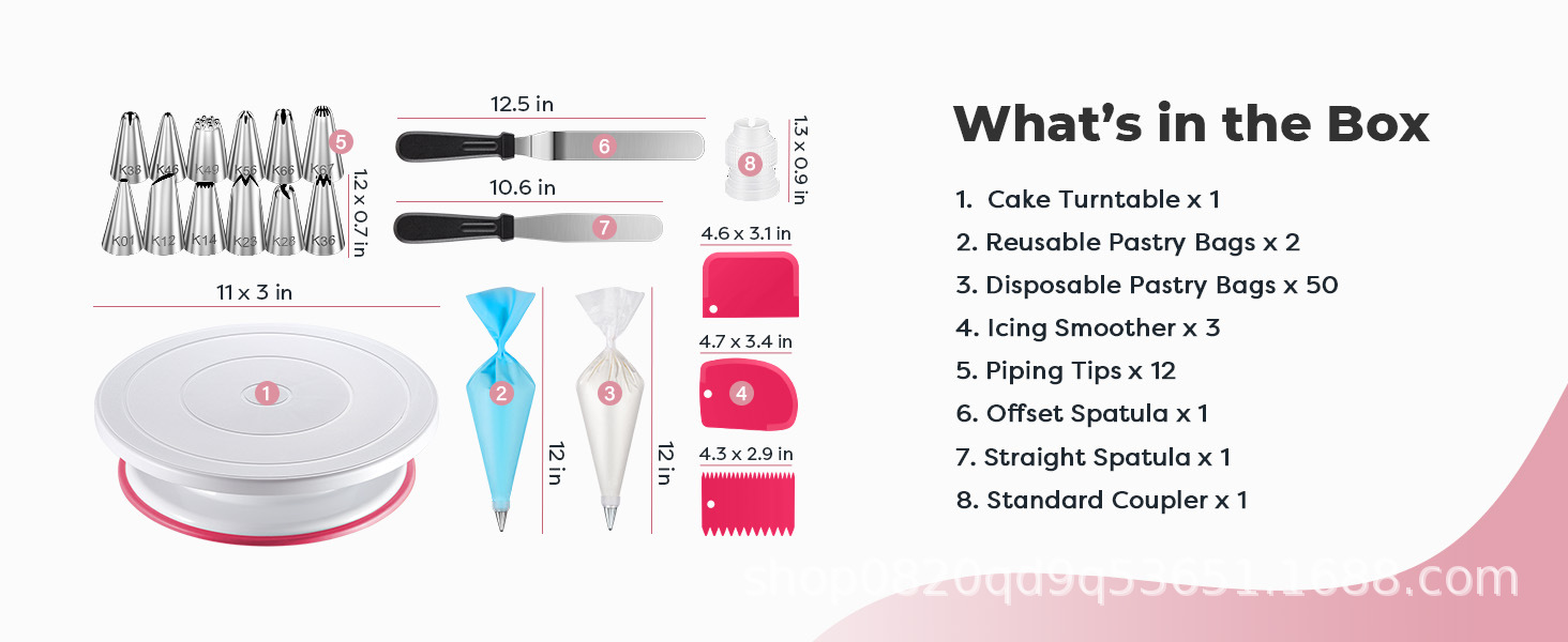 セットのコンポーネント ターンテーブル、デコレーションチップ、デコレーションバッグ、バタースクレーパー
