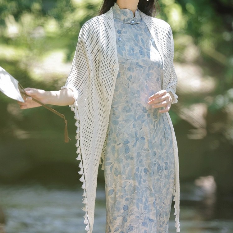 夏の新しいスタイルのチャイナドレスショール、薄くて優しいスタイルの三角形の中空メッシュショール、エアコン付きの外側のマント
