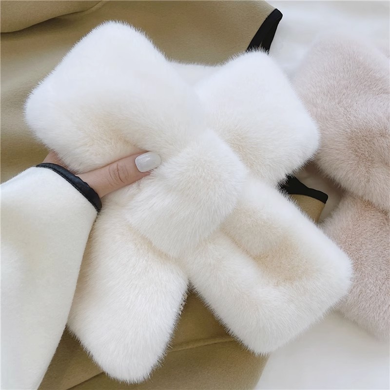 压花围巾女冬季仿獭兔毛围脖交叉又保暖护颈百搭可爱毛毛领子围巾