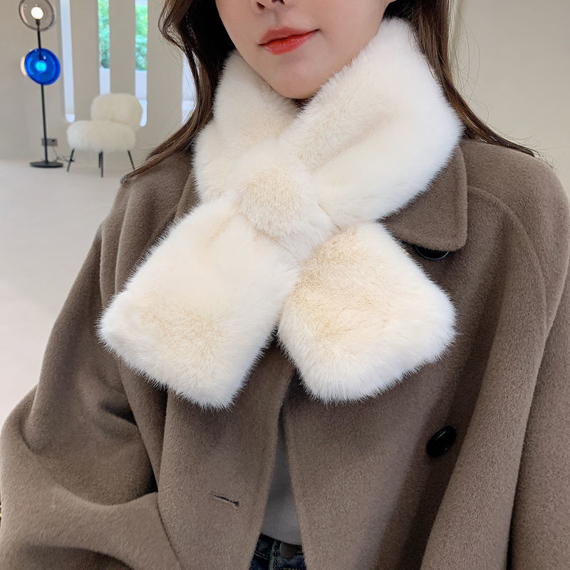 纯色毛绒围巾冬季护颈围脖韩版可爱毛毛绒仿獭兔学生加厚保暖交叉
