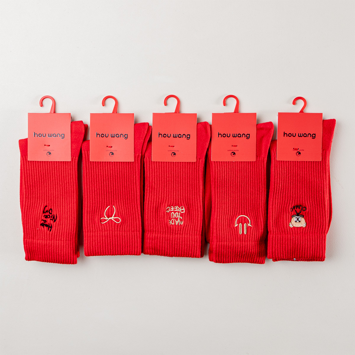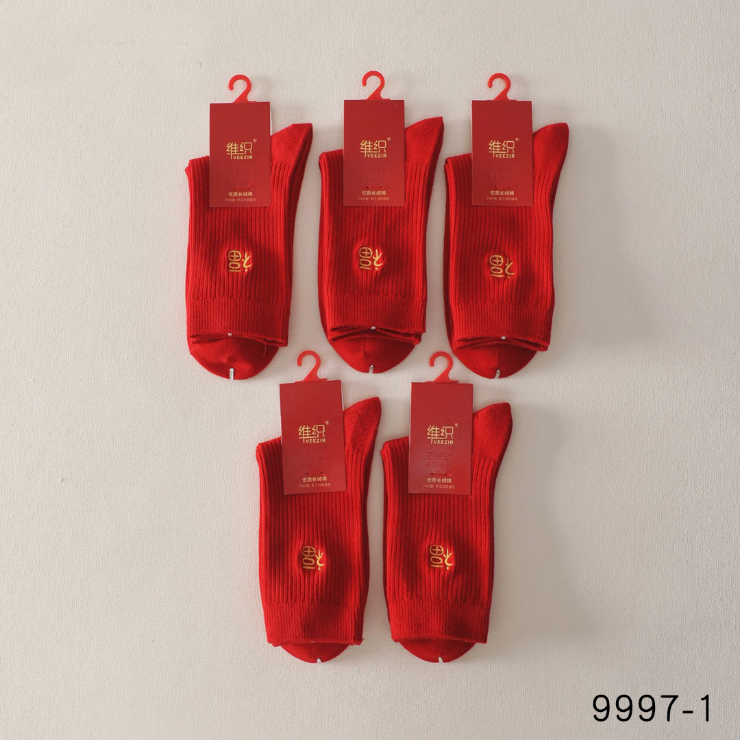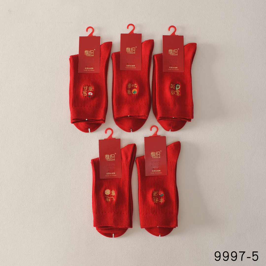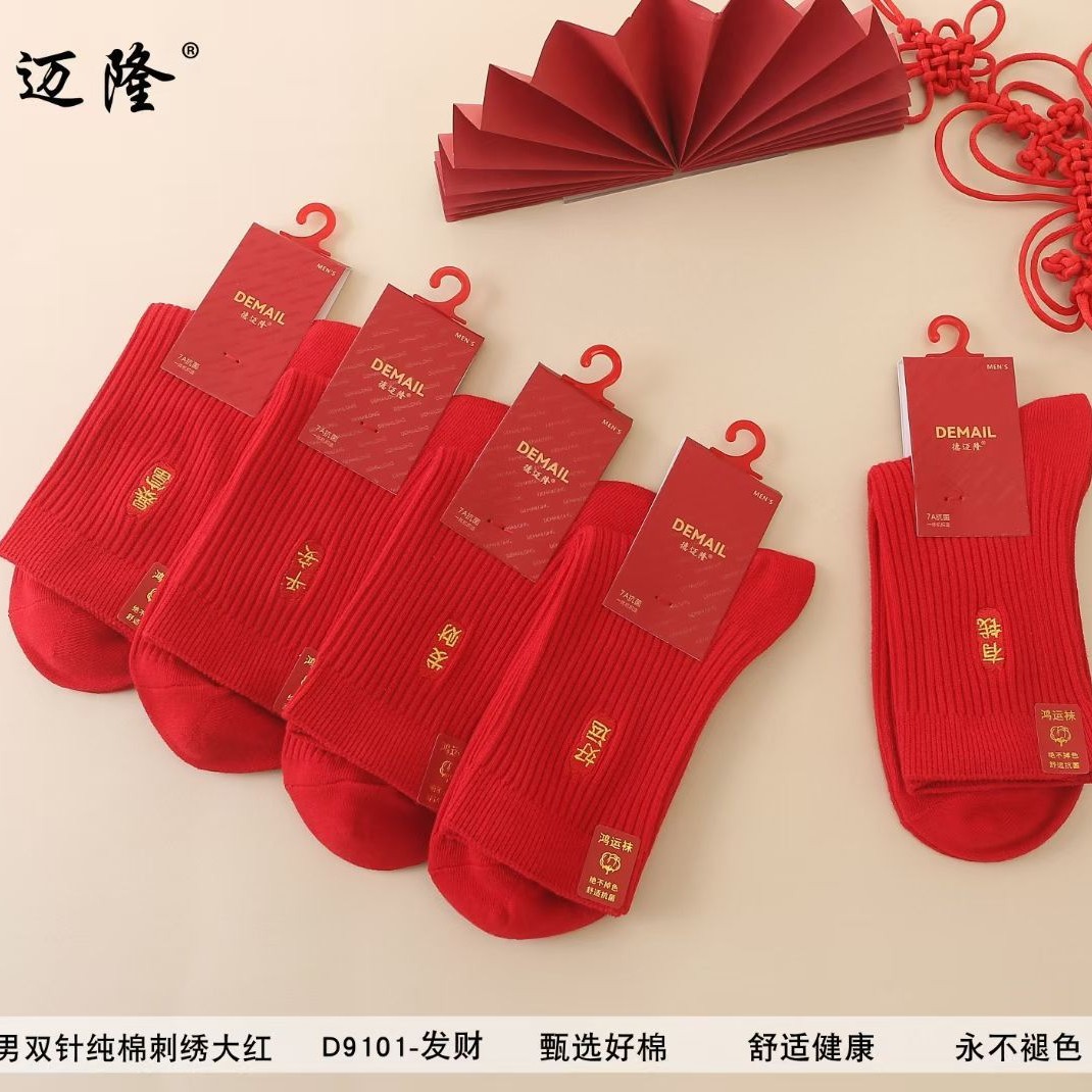 双针刺绣福字大红袜男女大红袜子本命年新年大红中筒袜刺绣红袜子
