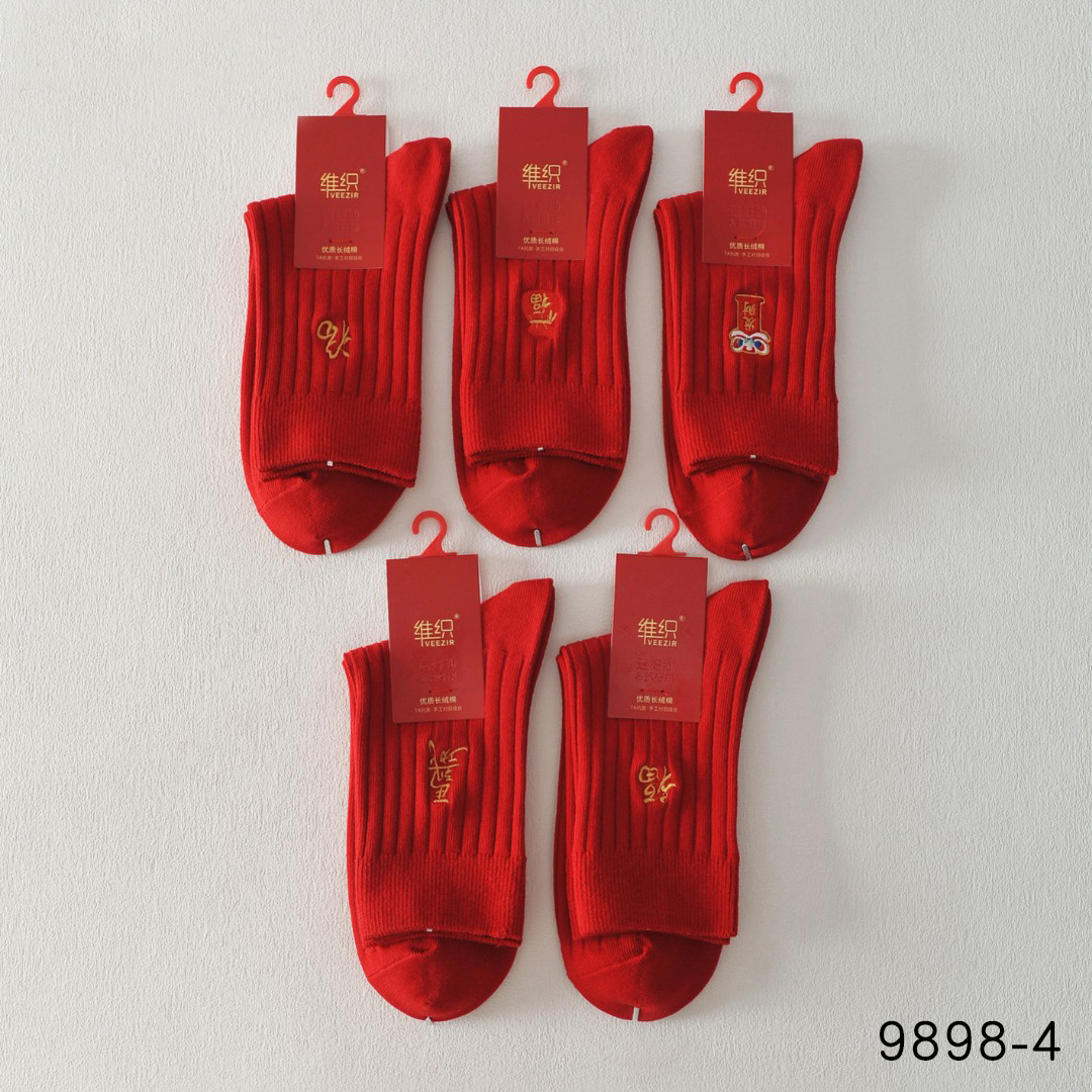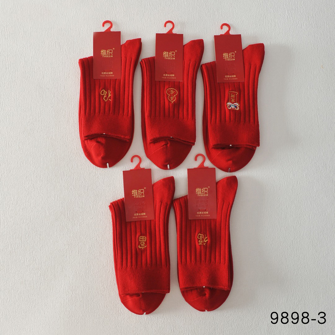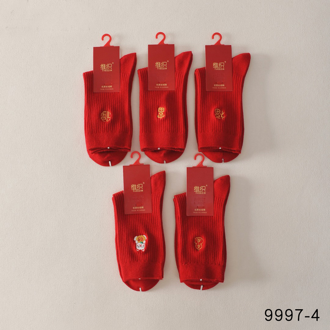 新作織り桑蚕糸赤色女性用靴下 手縫い快適で柔らかい刺繍入り靴下 福文字入り男性用綿100%赤色靴下