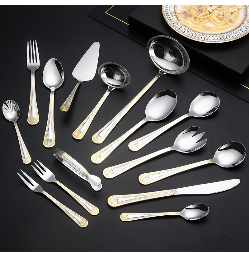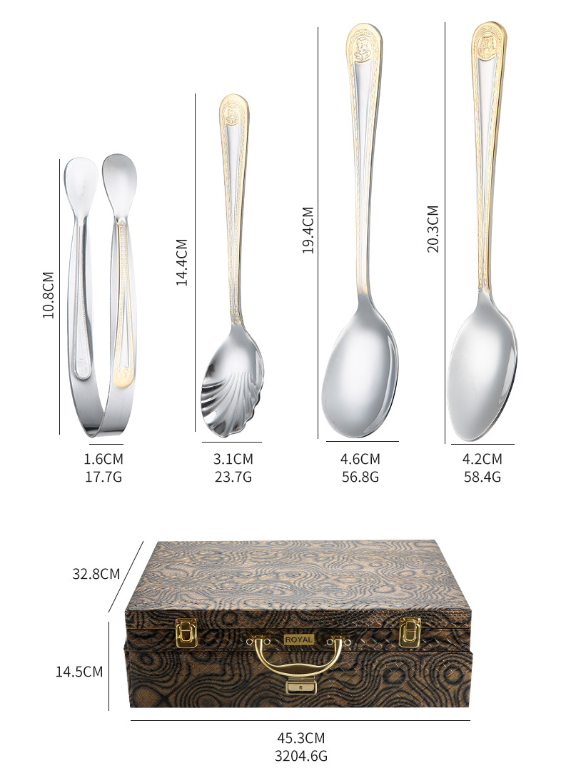 中東地区の人気食器セット72点セットのレリーフ宮廷局部金ステンレスナイフとフォークスプーンのギフトボックスの木箱
