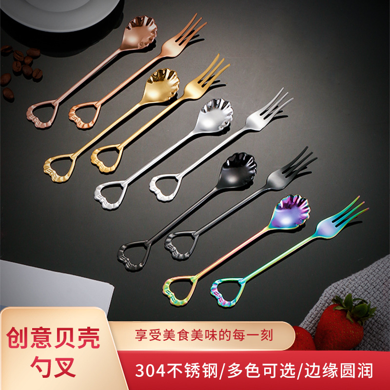 ステンレススプーンクリエイティブ貝殻攪拌スプーンコーヒースプーンデザートスプーン家庭用ケーキフォークかわいい果物フォーク