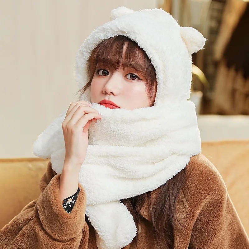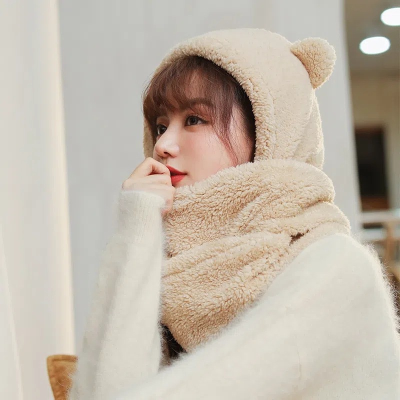 可爱加厚毛绒小熊帽子围巾一体女秋冬季韩版保暖护耳帽骑车防寒潮