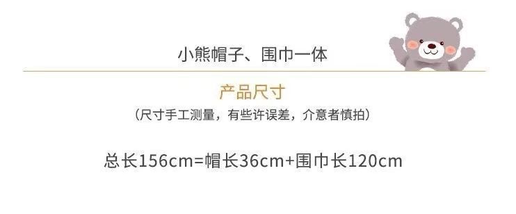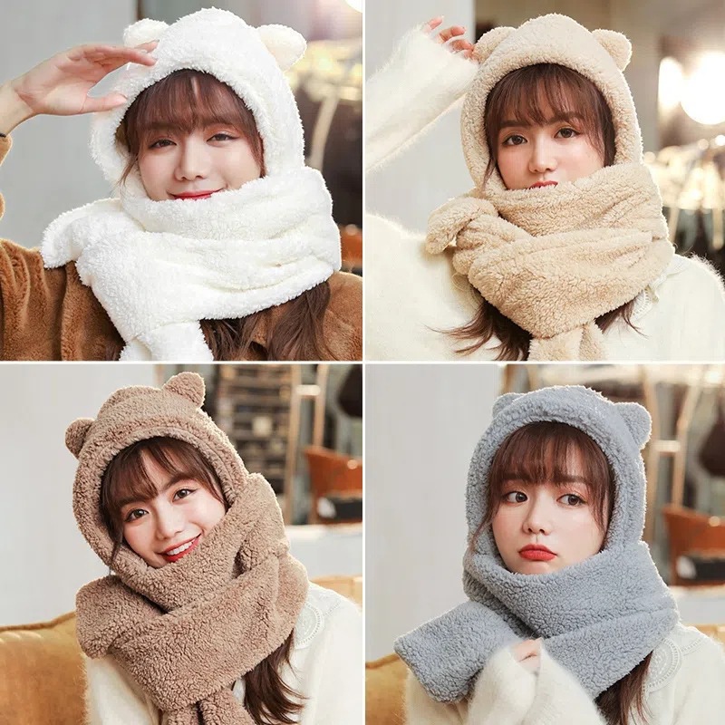 冬季可爱小熊三件套帽子手套围巾一体保暖百搭帽加绒加厚毛绒帽女