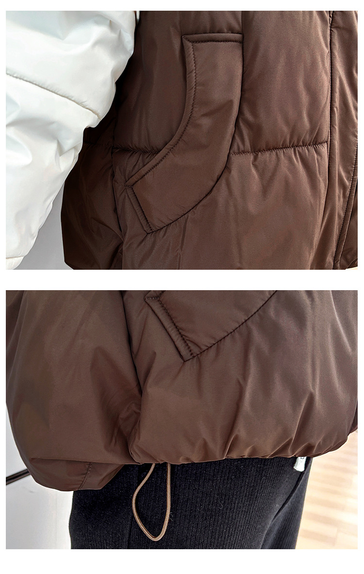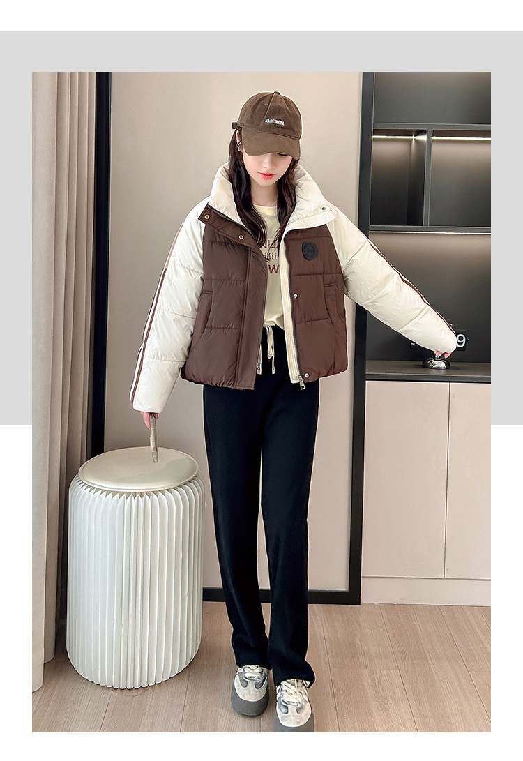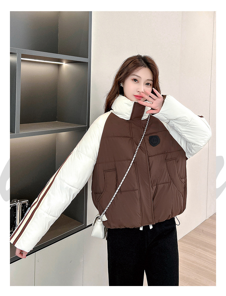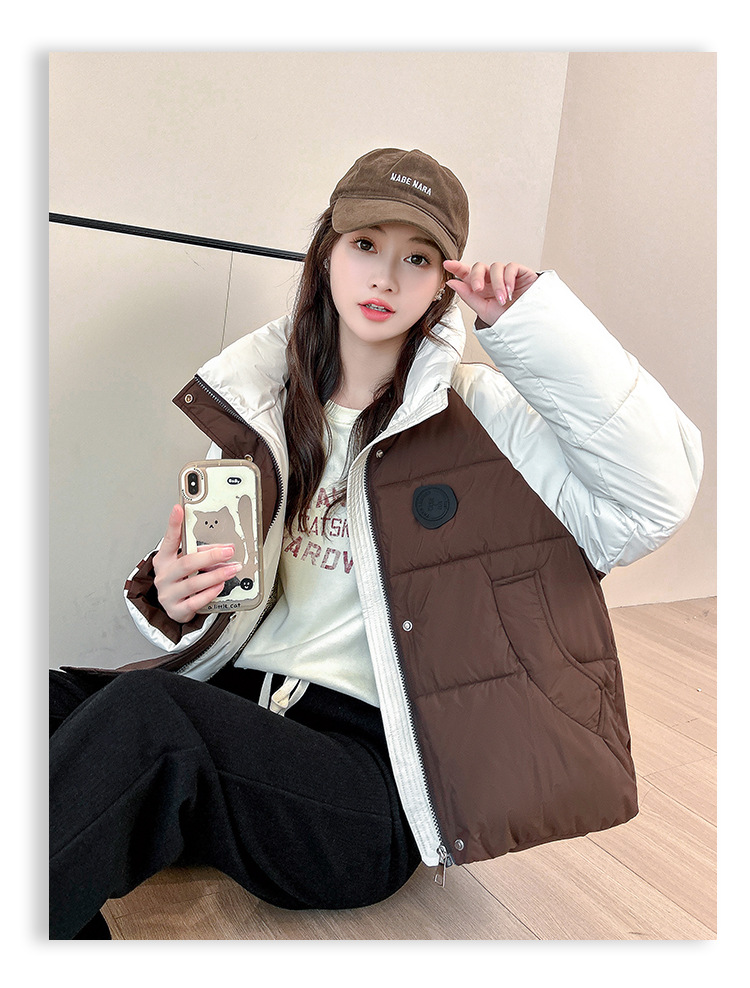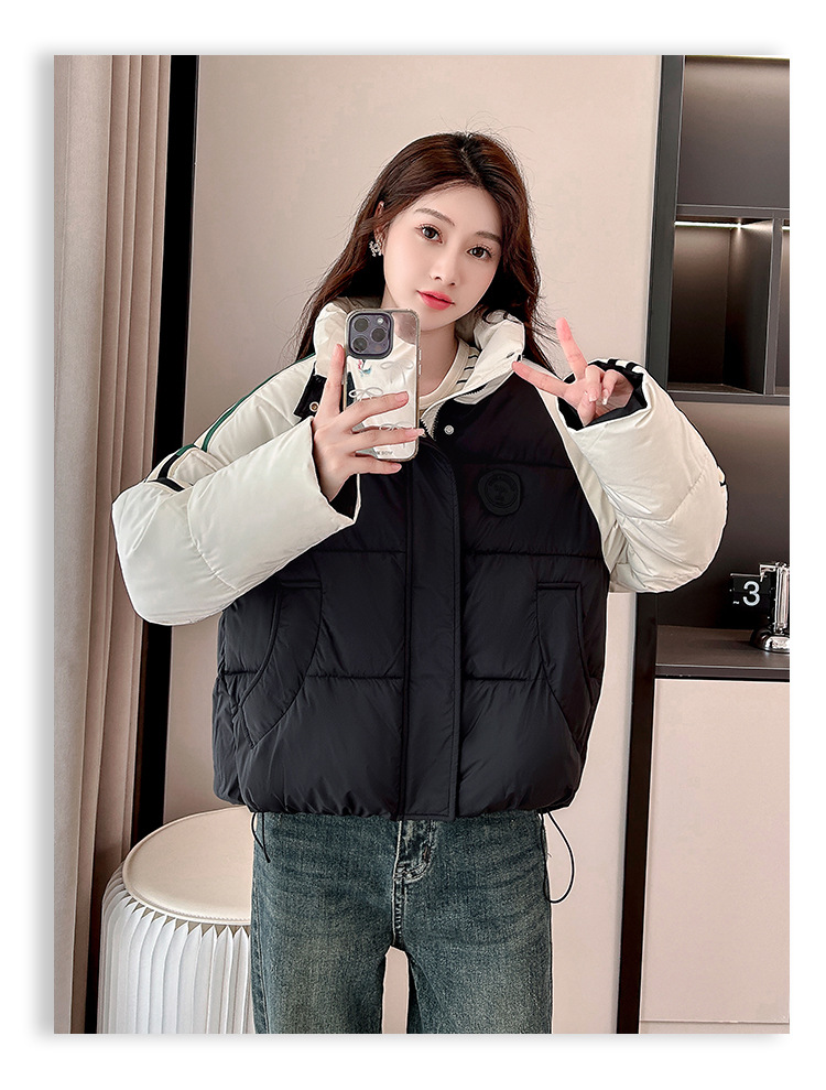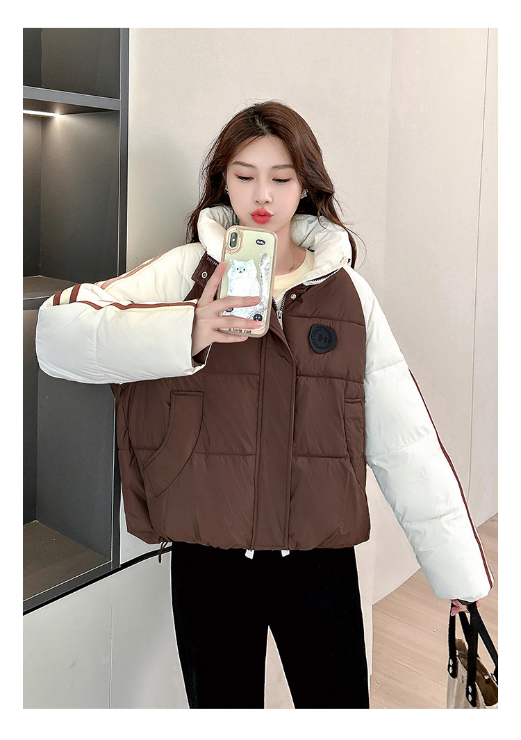 綿の服の女性の短い金の2024冬の新型の韓国版のゆったりしている大きいサイズは色の学院の風のパンの綿の服にぶつかってコートを厚くします。