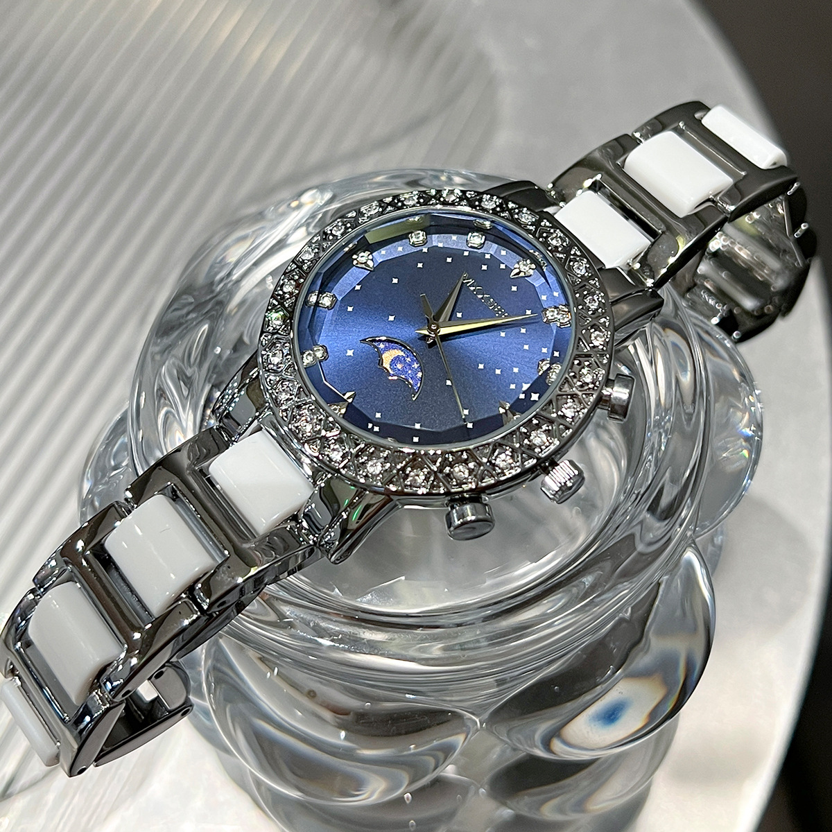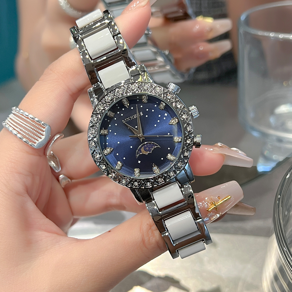 MXXSEE震える音が爆発した円形の日月星にダイヤモンドの女性バンドのカレンダーの鋼帯の陶磁器の腕時計の防水は汗を防ぎます。