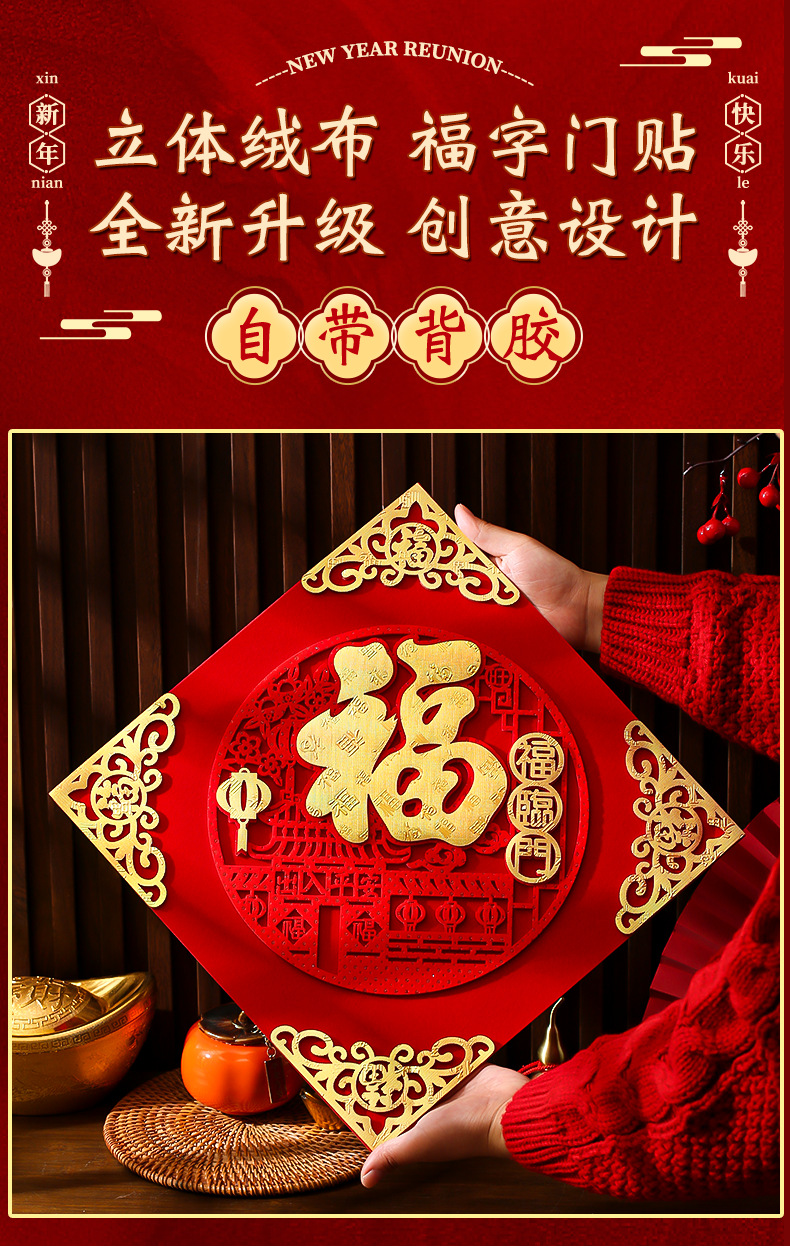 2026年馬年福字門飾り 立体ベルベット粘着式玄関ドア春節新年福字ステッカー