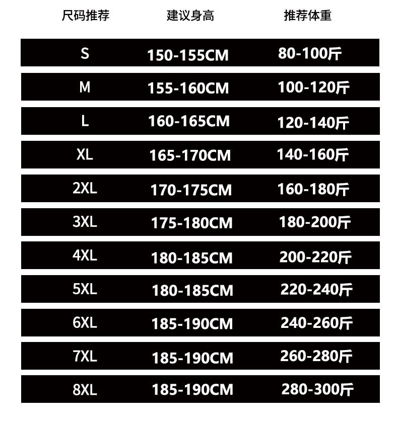 S,M,L,XL,XXL,XXXL,XXXXL,5XL,6XL,7XL,8XL