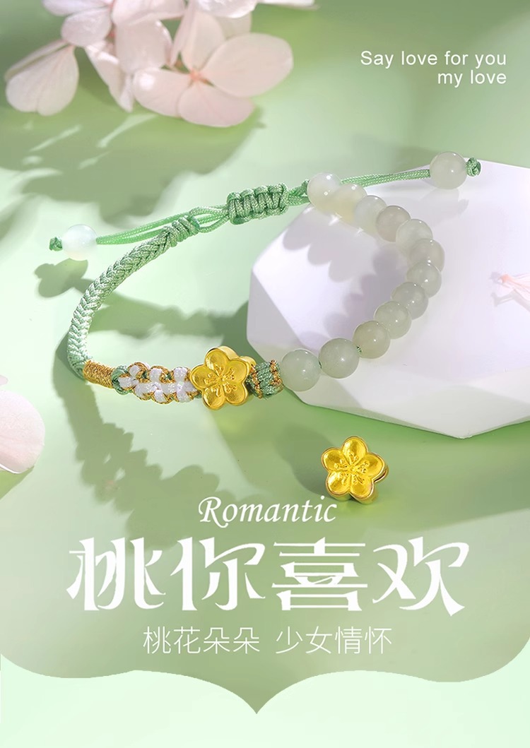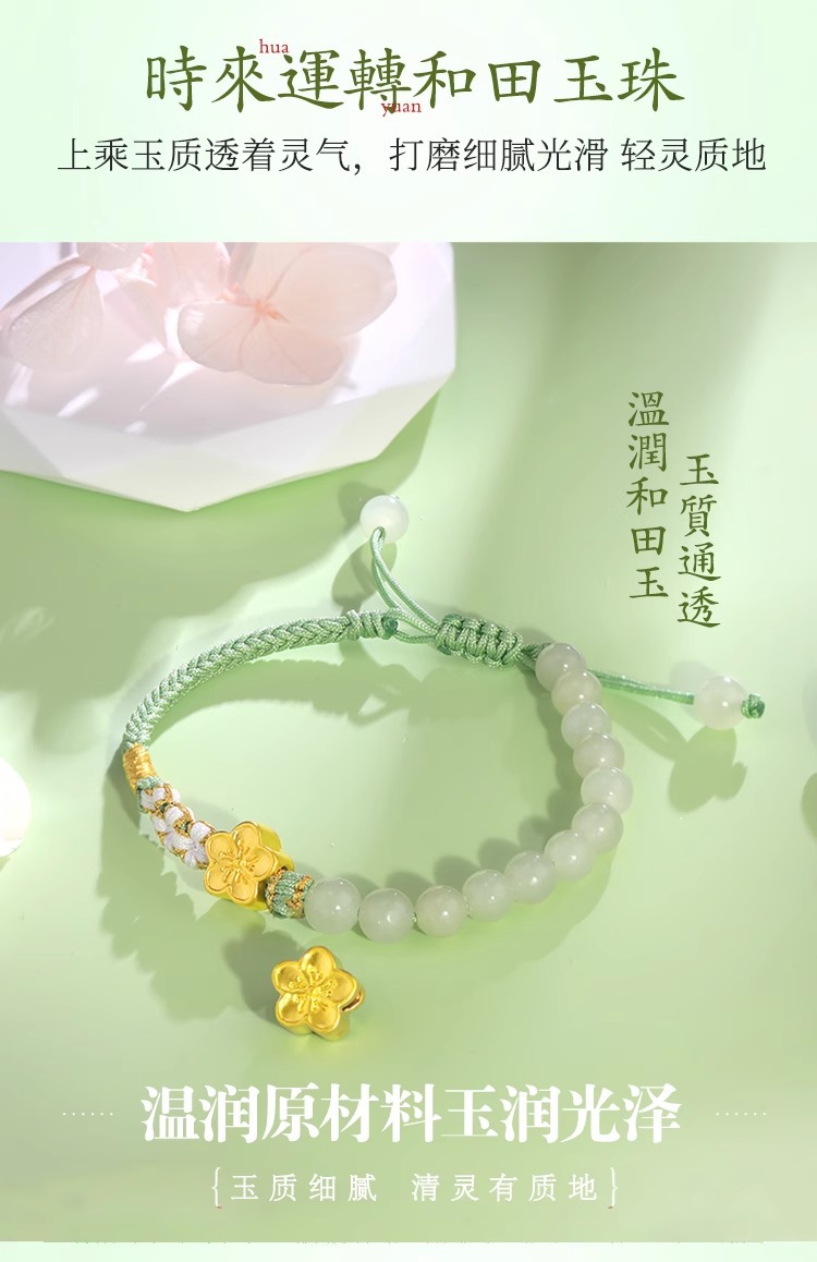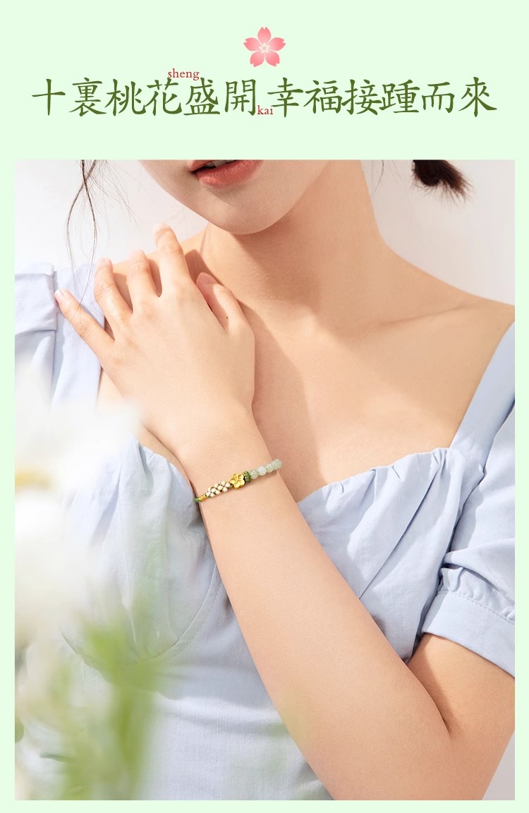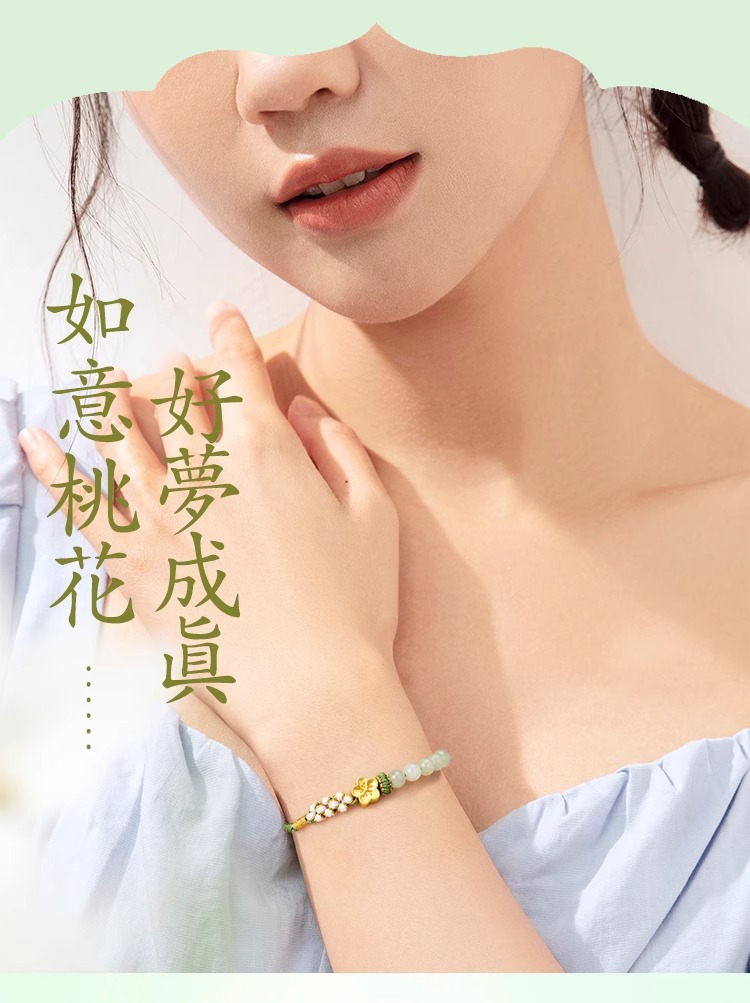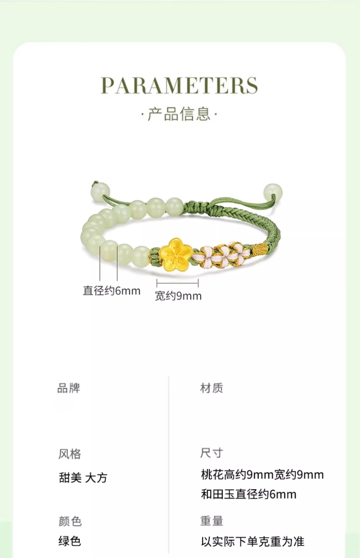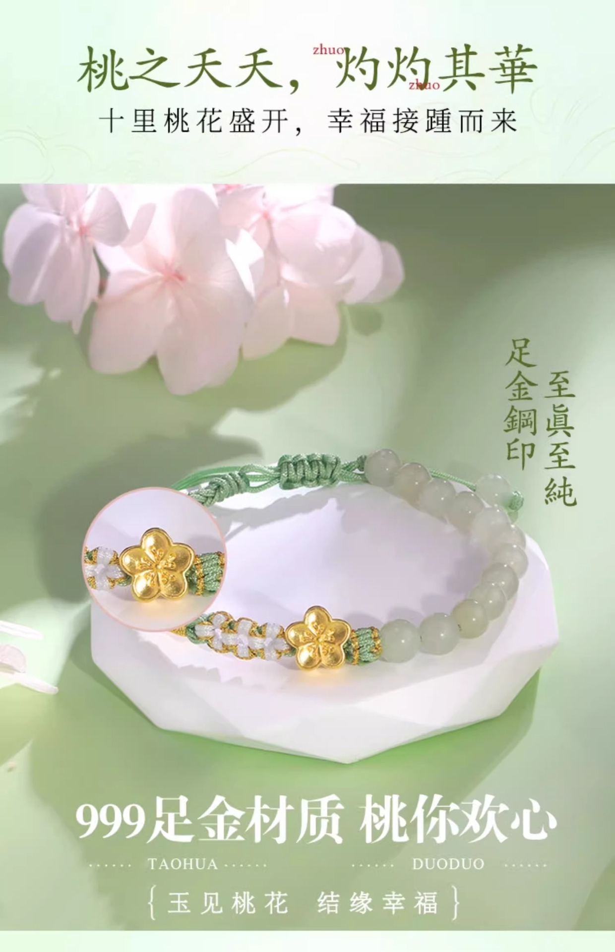 Jiu Fengxiang 999 純金銀巻き桃花ゴールドブレスレット、女性用、ホータン翡翠トランスファービーズ編み込みブレスレット、フレッシュで甘い