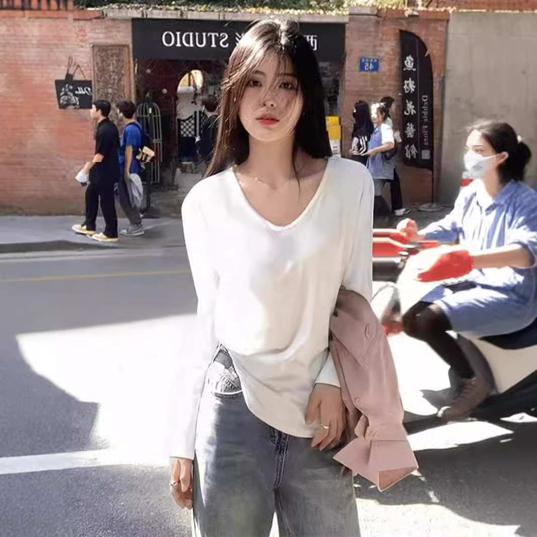 2025秋季新款白色慵懒松弛感V领正肩长袖T恤女宽松显瘦打底衫上衣