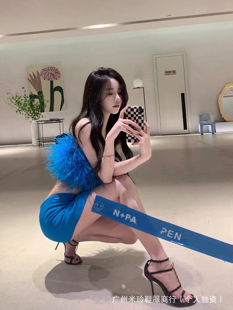 高版のハイヒールの女性の楊林の1字はサンダルの細いと金属のアルファベットのボタンのハイヒールの露指の細いとサンダルの女性を持ちます。