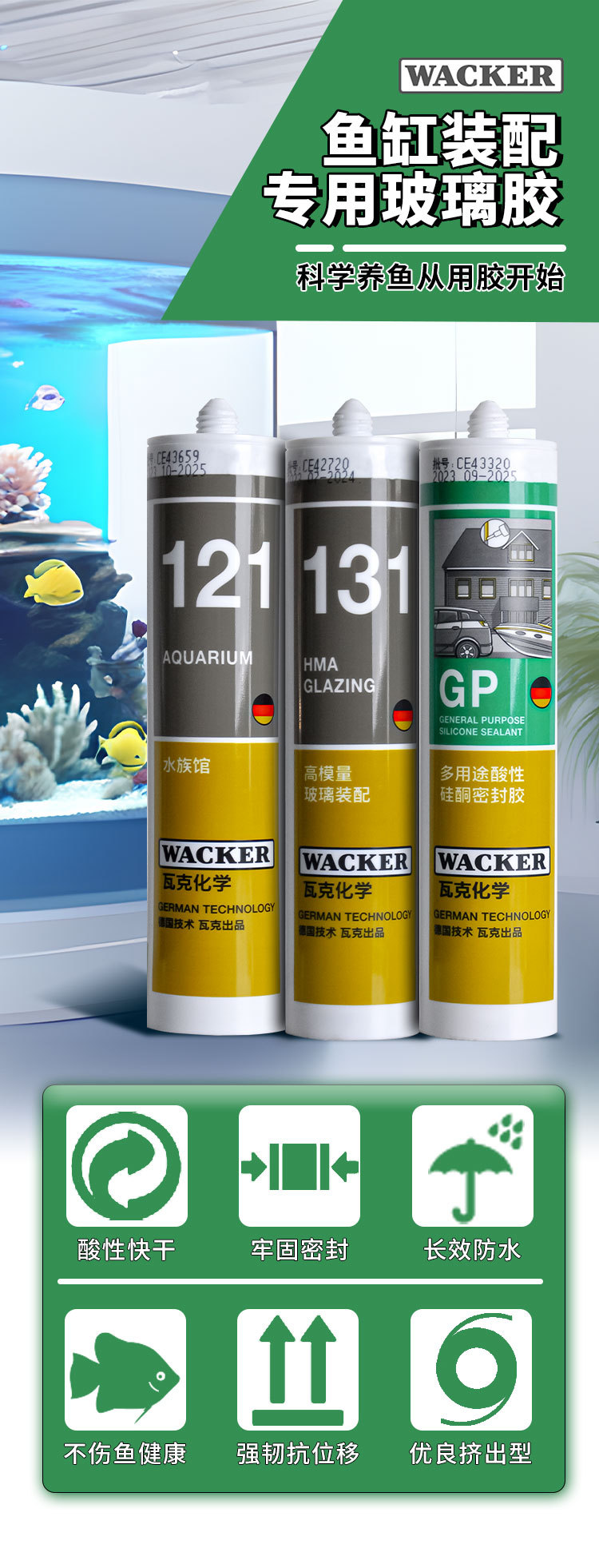 德国瓦克121鱼缸玻璃胶水族箱专用131酸性快干强力透明防水密封胶
