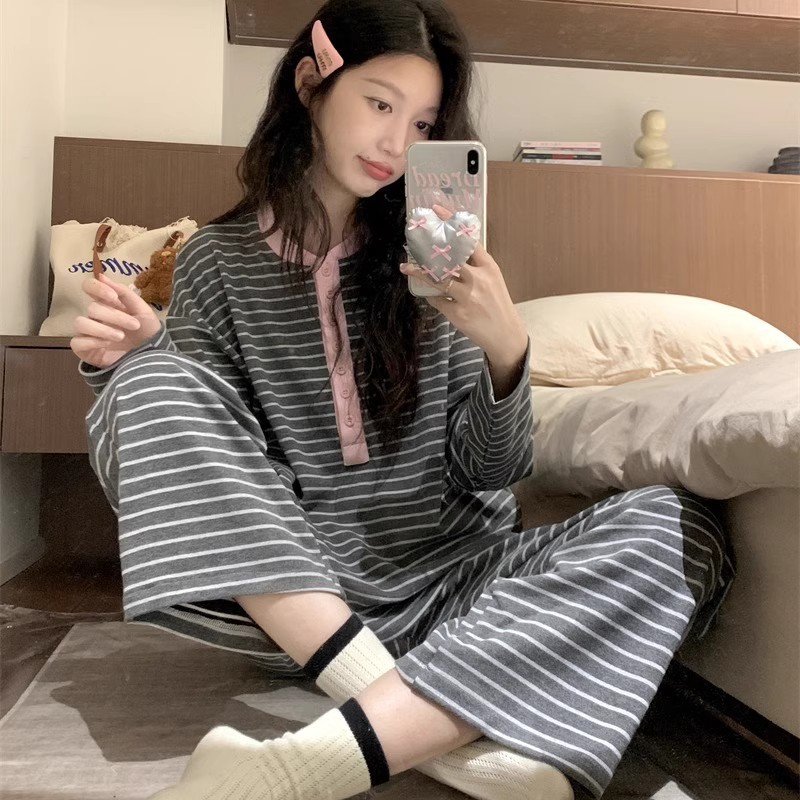 ins韓国風ストライプパジャマレディース春秋長袖スーツ高級クロスボーダーホーム服秋大きいサイズ屋外で着用可能
