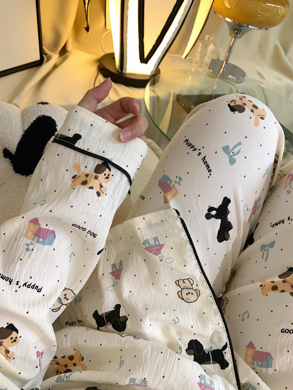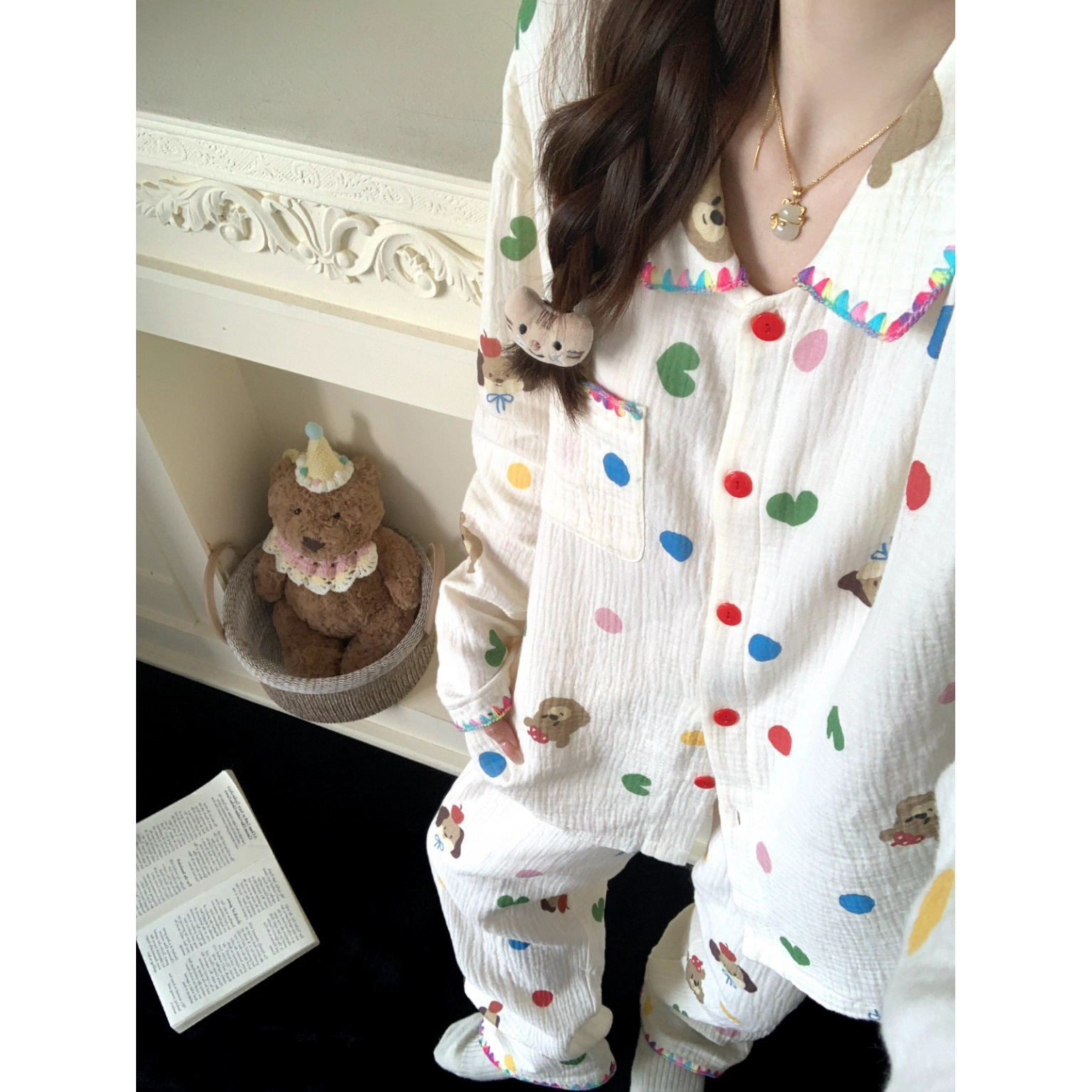 雲の綿のガーゼのパジャマの女性の2024新型の春と秋の長袖のスーツのinsの漫画の家庭服のかわいい外着