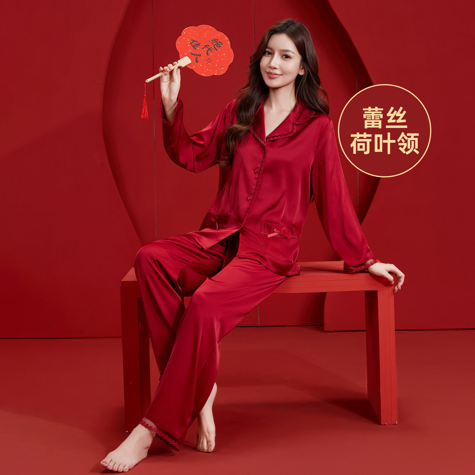 现货冰丝春秋本命年红色结婚家居服情侣睡衣女长袖大码套装批发