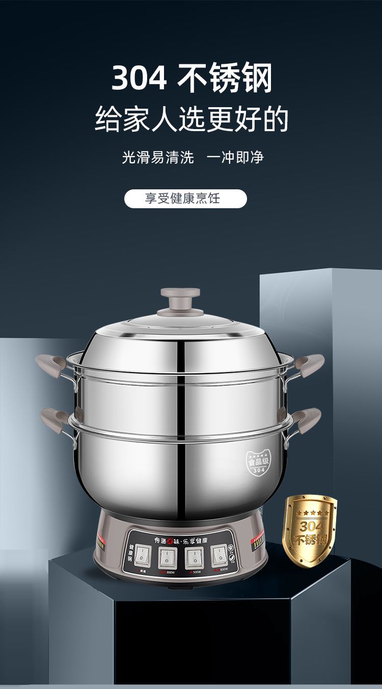 304ステンレス鋼電気フライパン電気鍋家庭用電気調理鍋蒸し電気鍋食品グレード耐久性10年