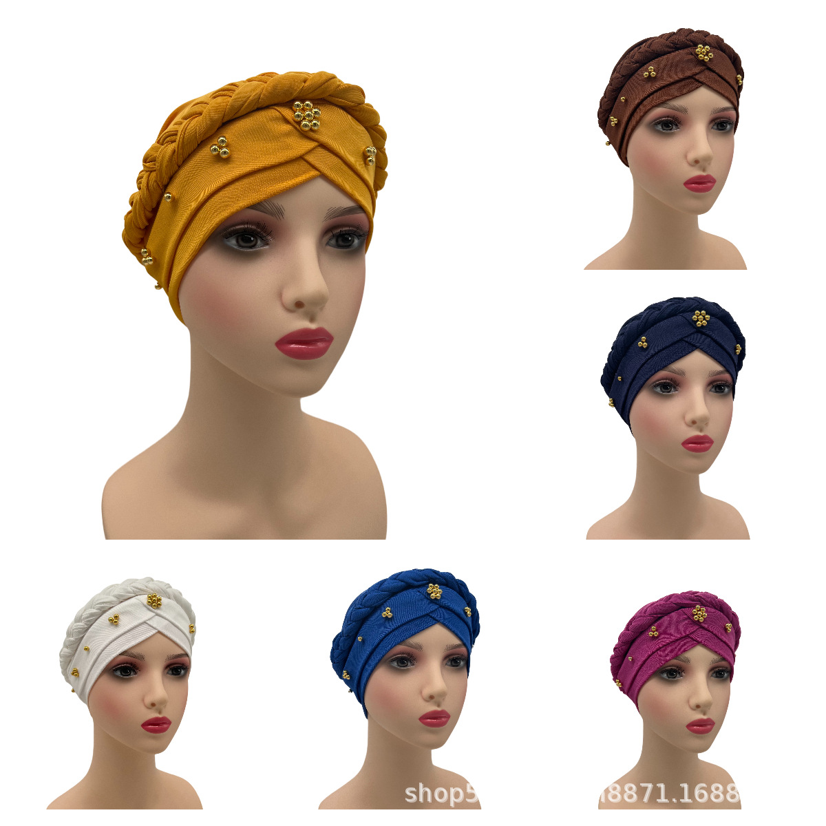 アマゾン新作 欧米風 春秋 ムスリム バイオレットキャップ ミルクシルク 無地 ビーズ付き バイザーキャップ 編み込み