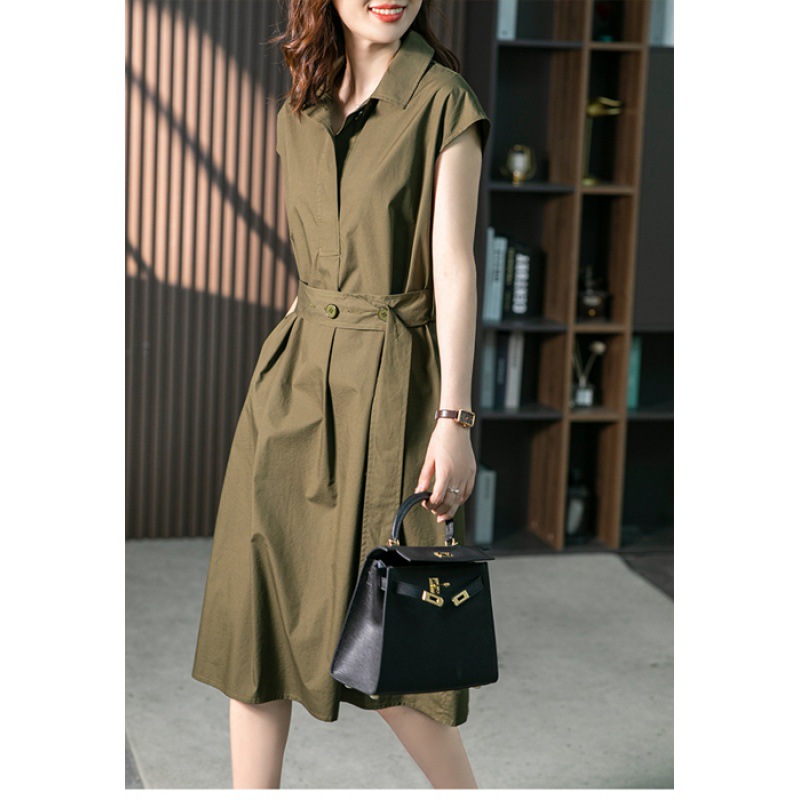 2026年夏 文芸風 カジュアル ゆったり 大きめサイズ レディース 無地 ウエストシェイプ 着痩せ効果 シャツワンピース ミディアム丈ワンピース