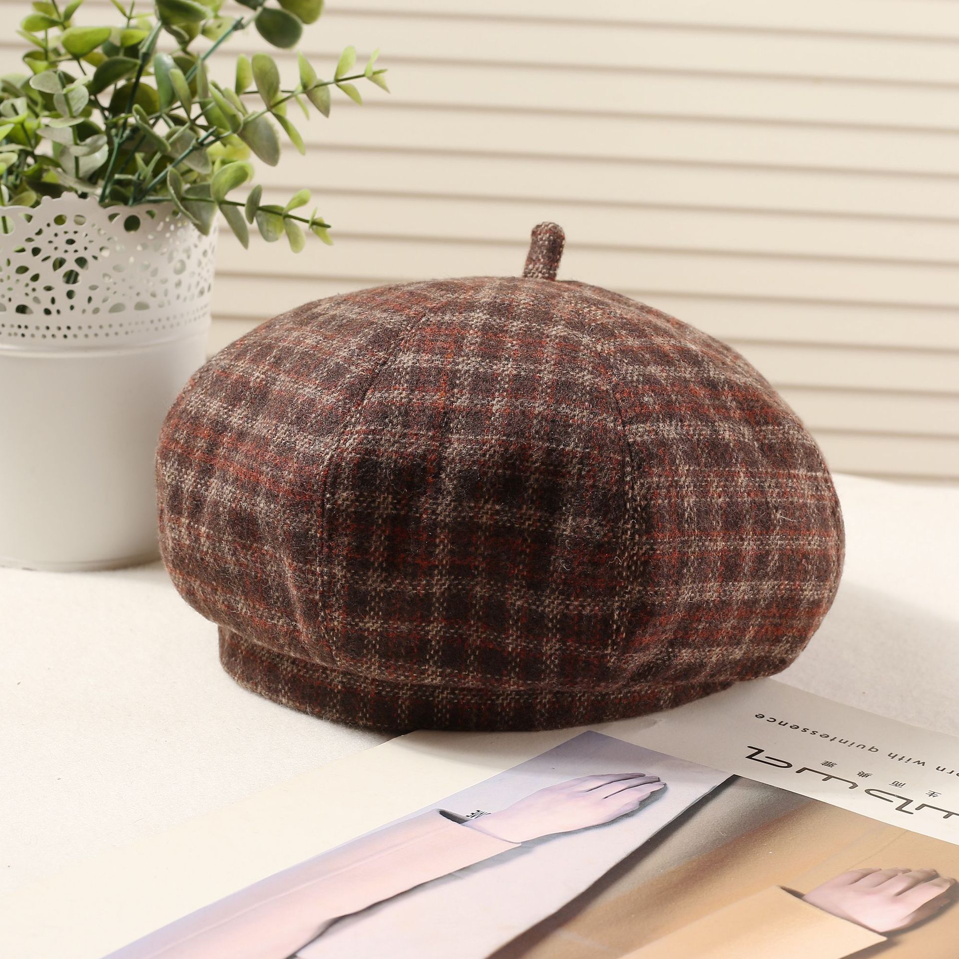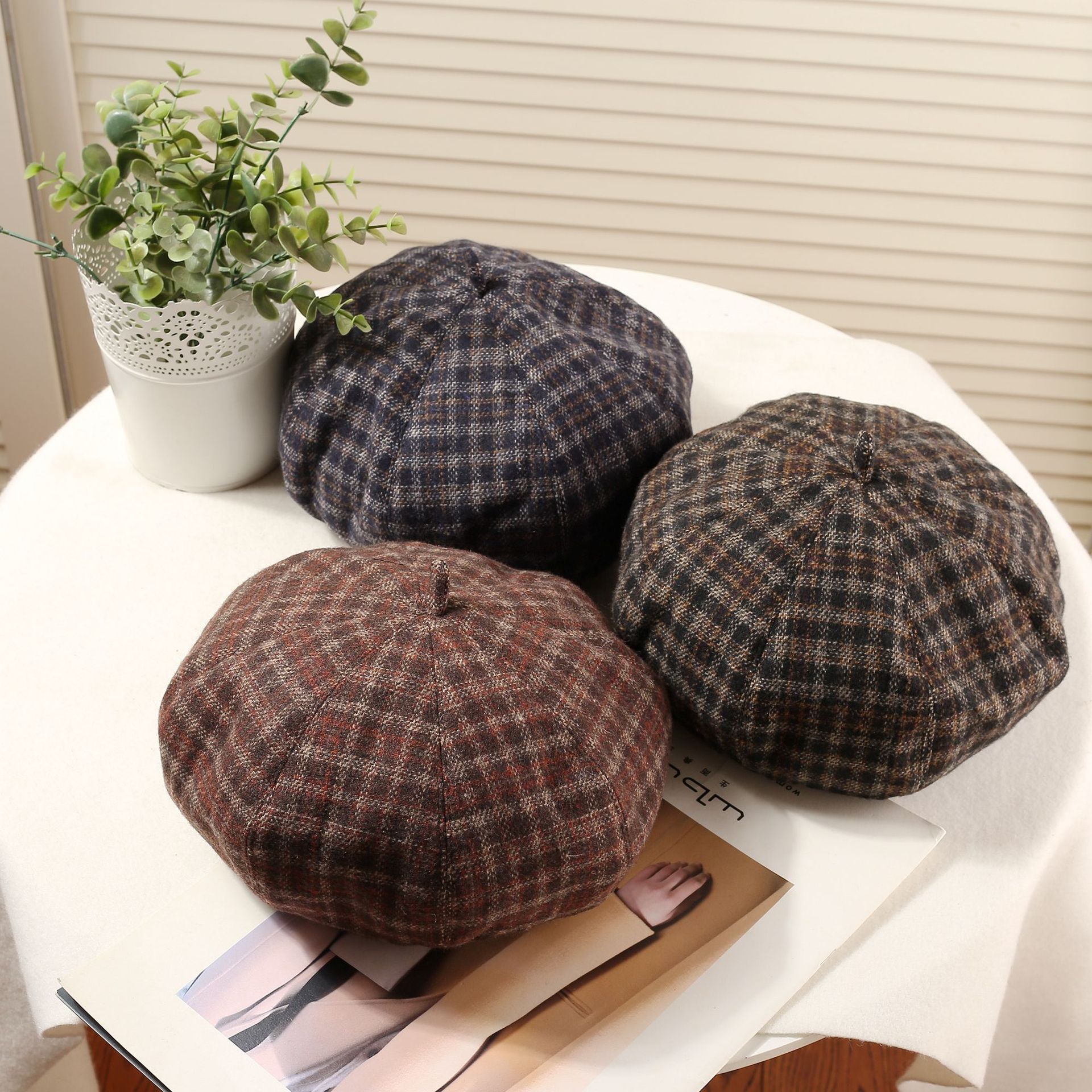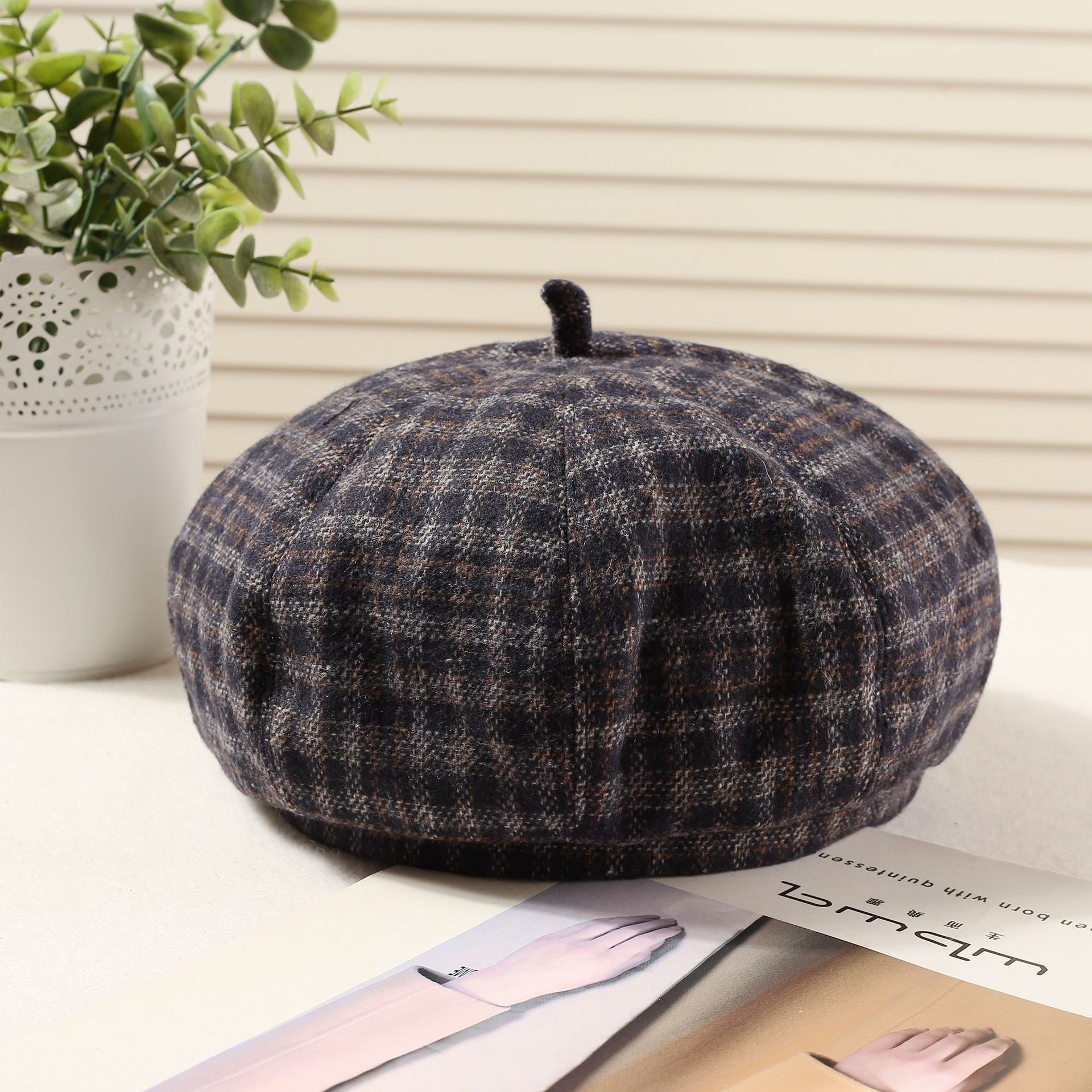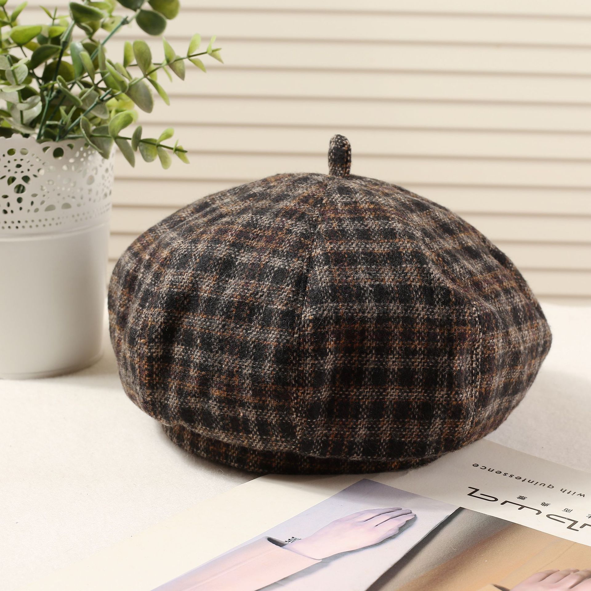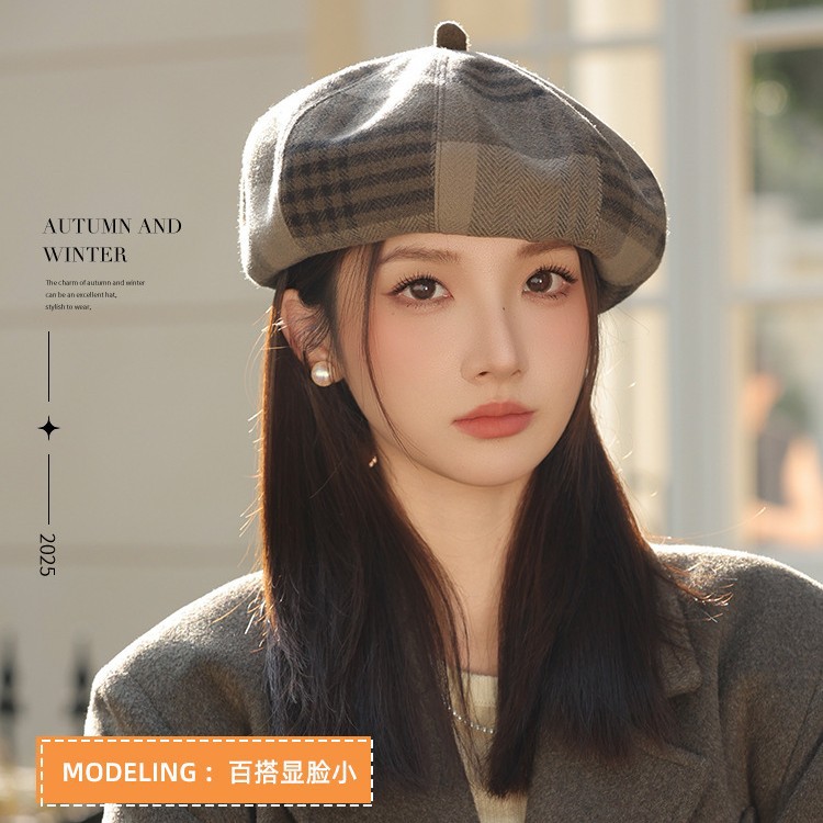 おしゃれな秋冬の韓国版の格子縞のレトロな毛は、八角帽子と秋冬の雰囲気感をつなぎ合わせてベレー帽を合わせます。