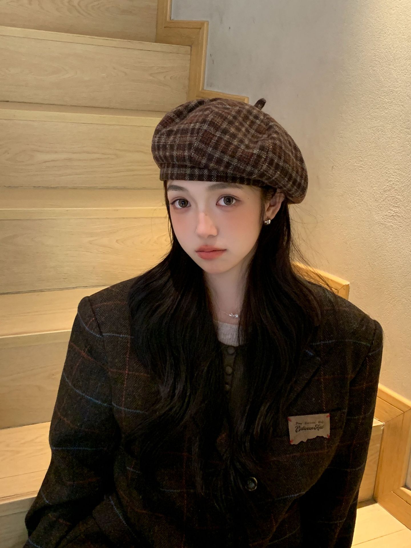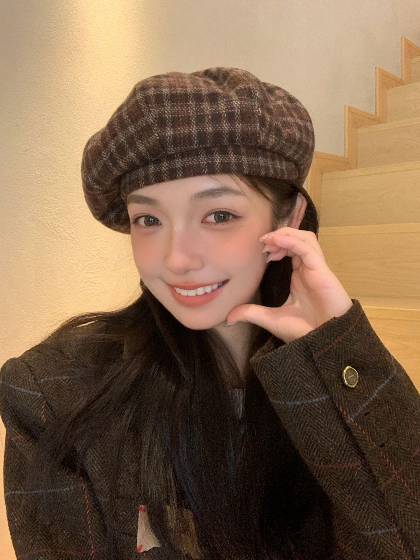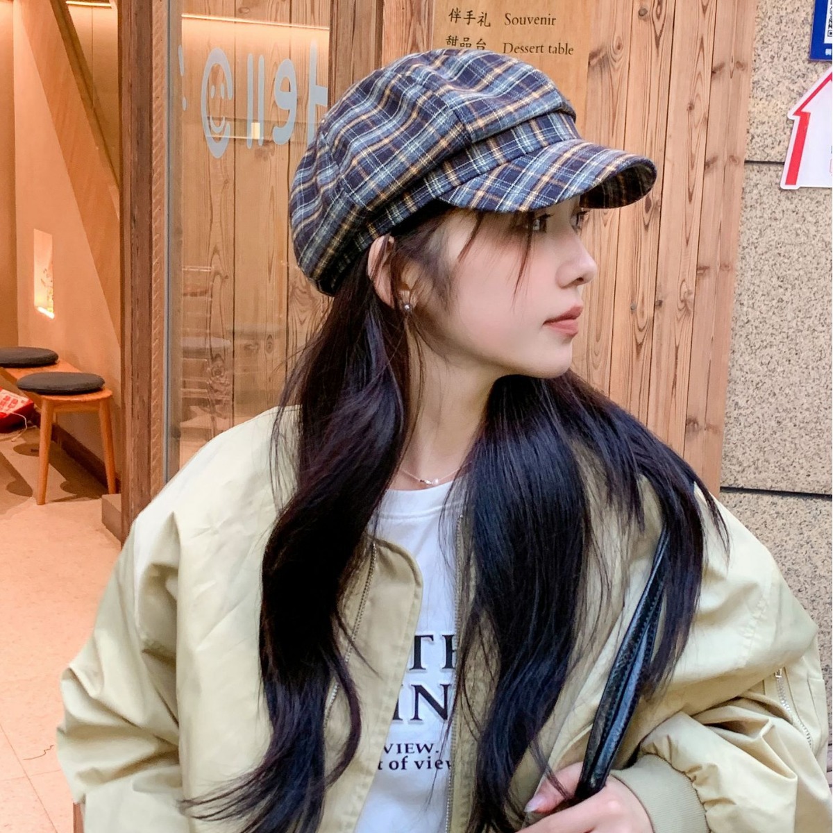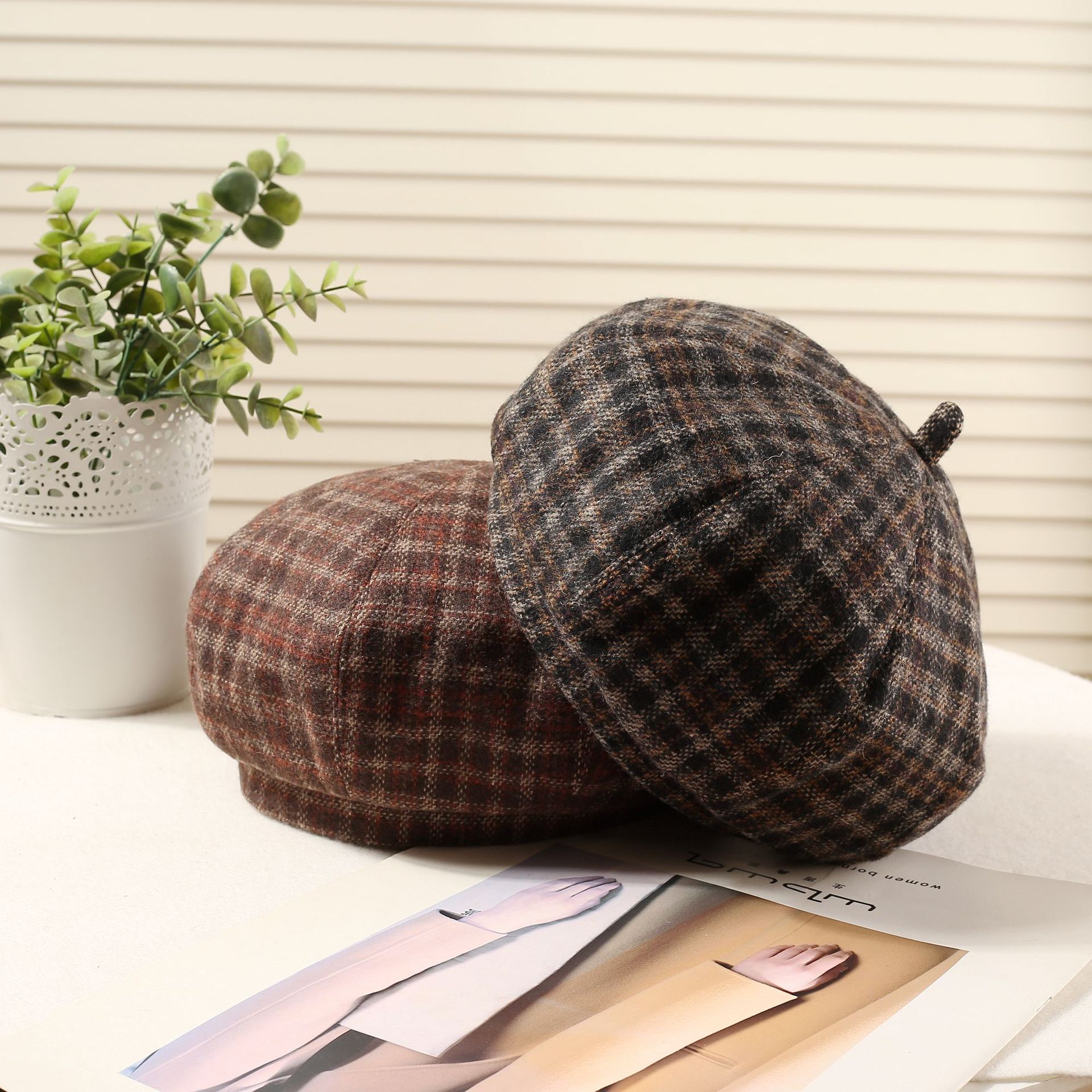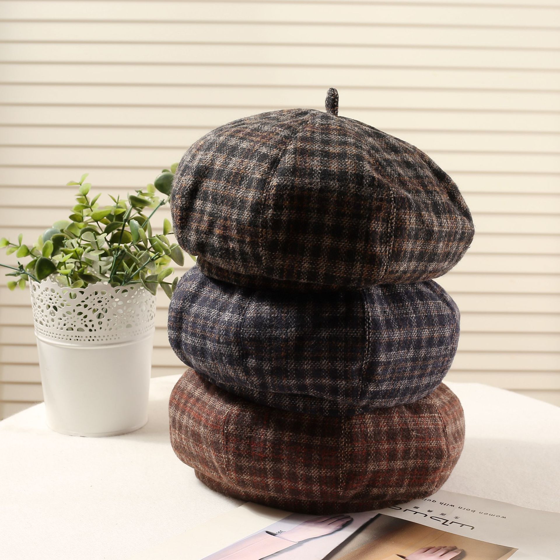 おしゃれな秋冬の韓国版の格子縞のレトロな毛は、八角帽子と秋冬の雰囲気感をつなぎ合わせてベレー帽を合わせます。