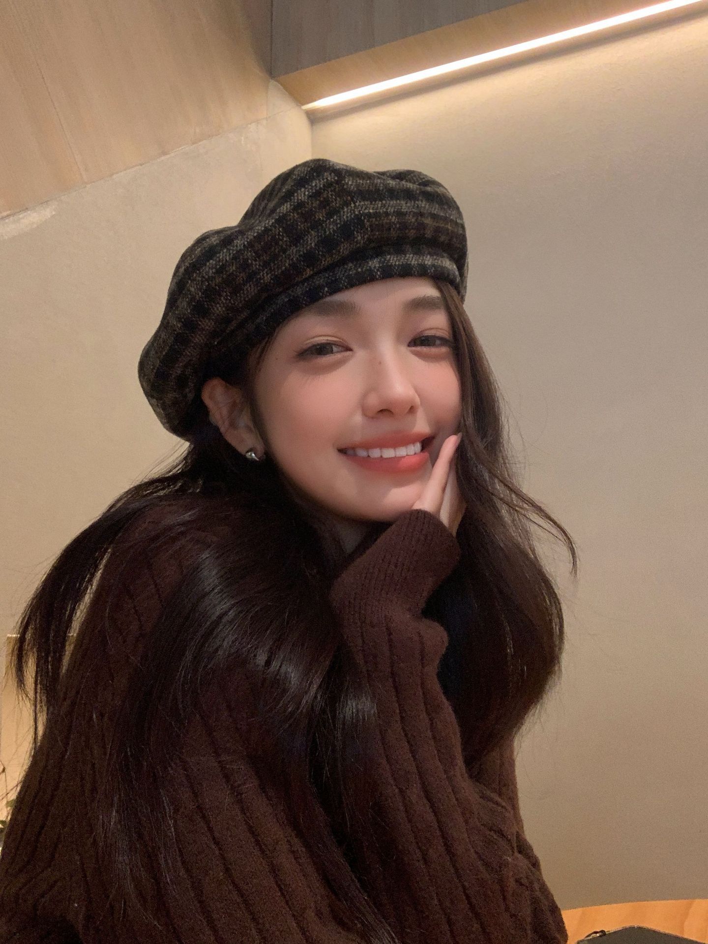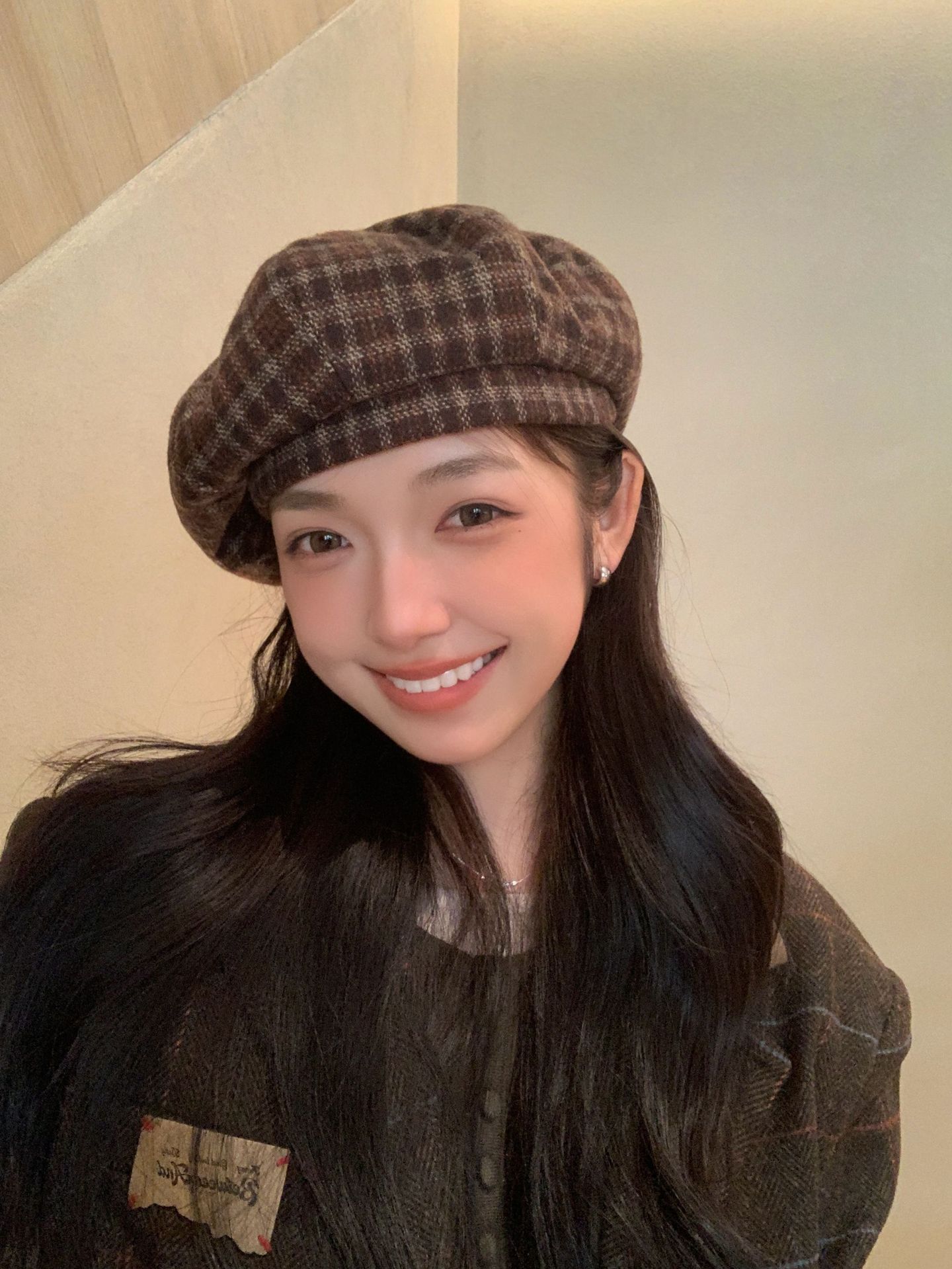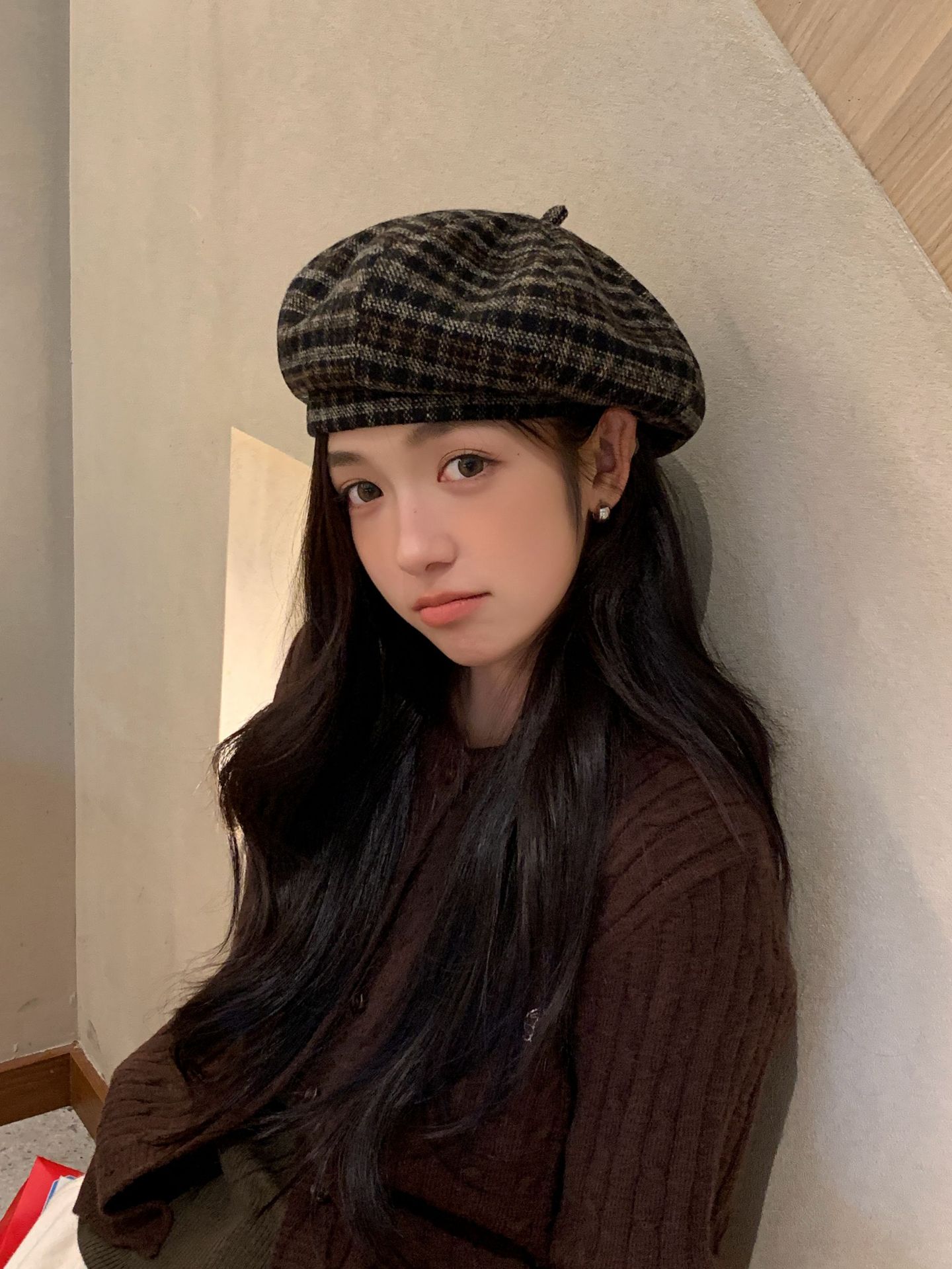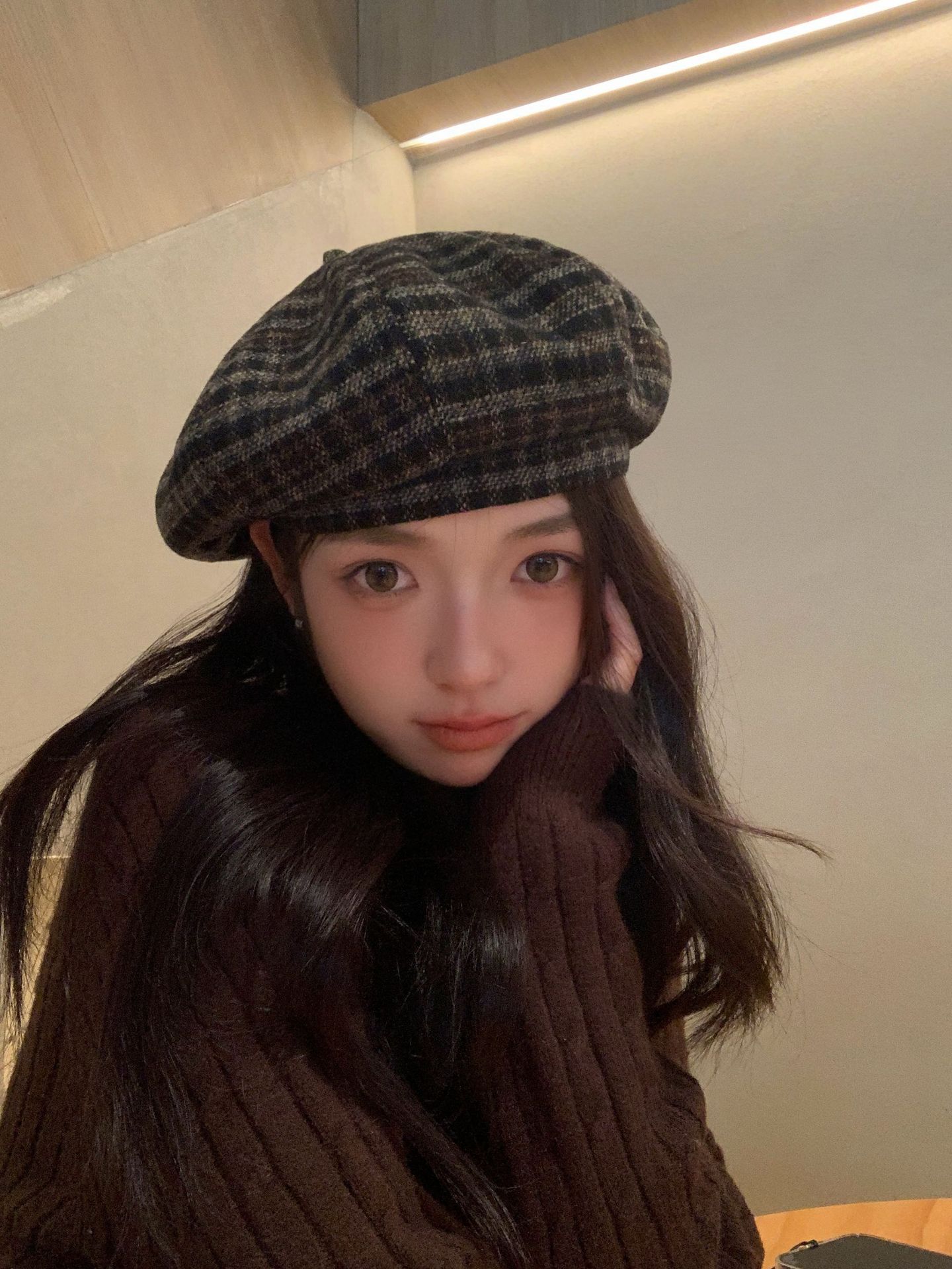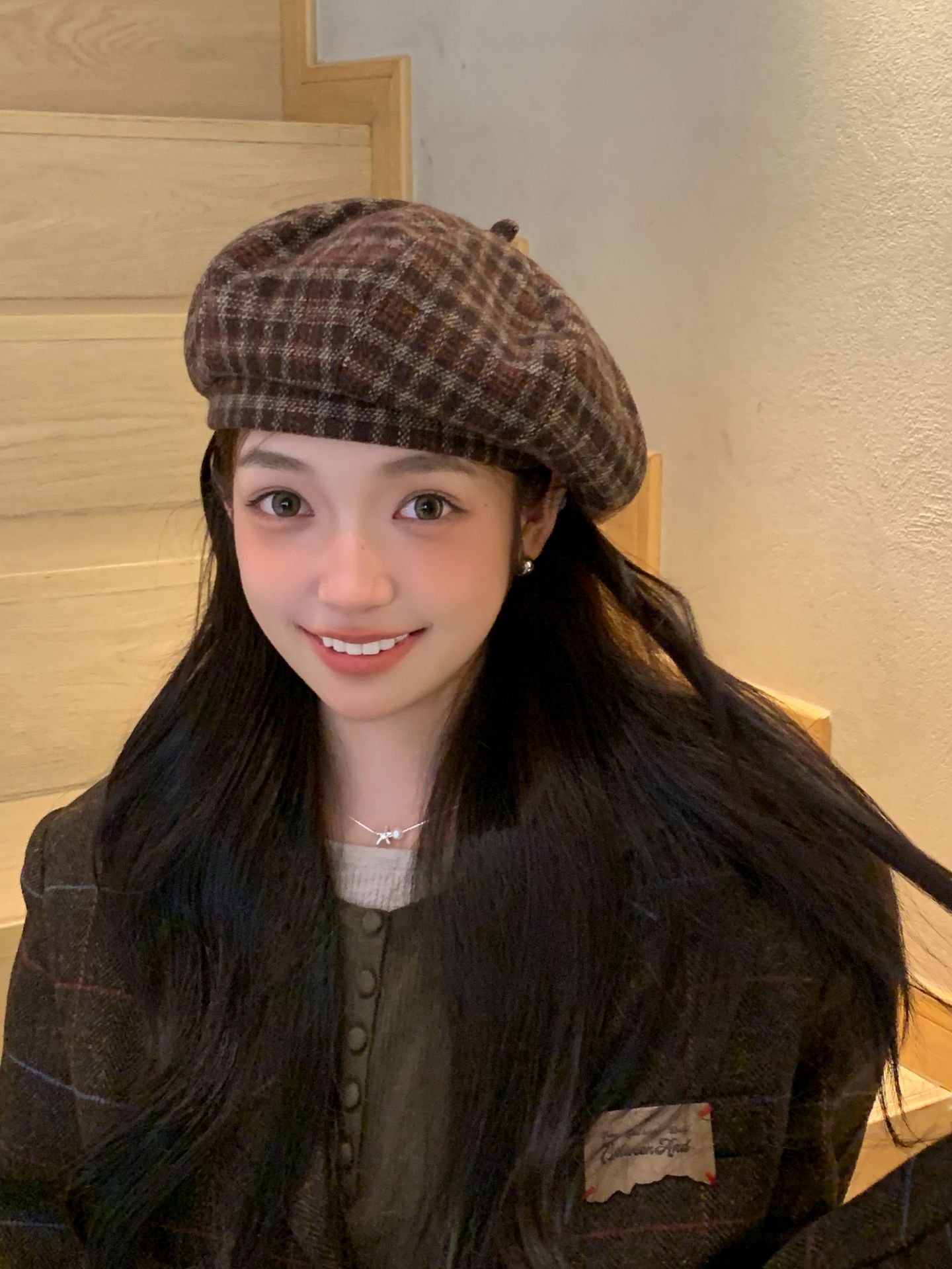 おしゃれな秋冬の韓国版の格子縞のレトロな毛は、八角帽子と秋冬の雰囲気感をつなぎ合わせてベレー帽を合わせます。