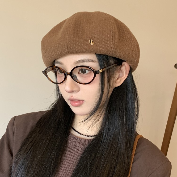 2025年新款日系秋冬羊毛呢贝雷帽子女复古百搭金属j标画家帽韩版