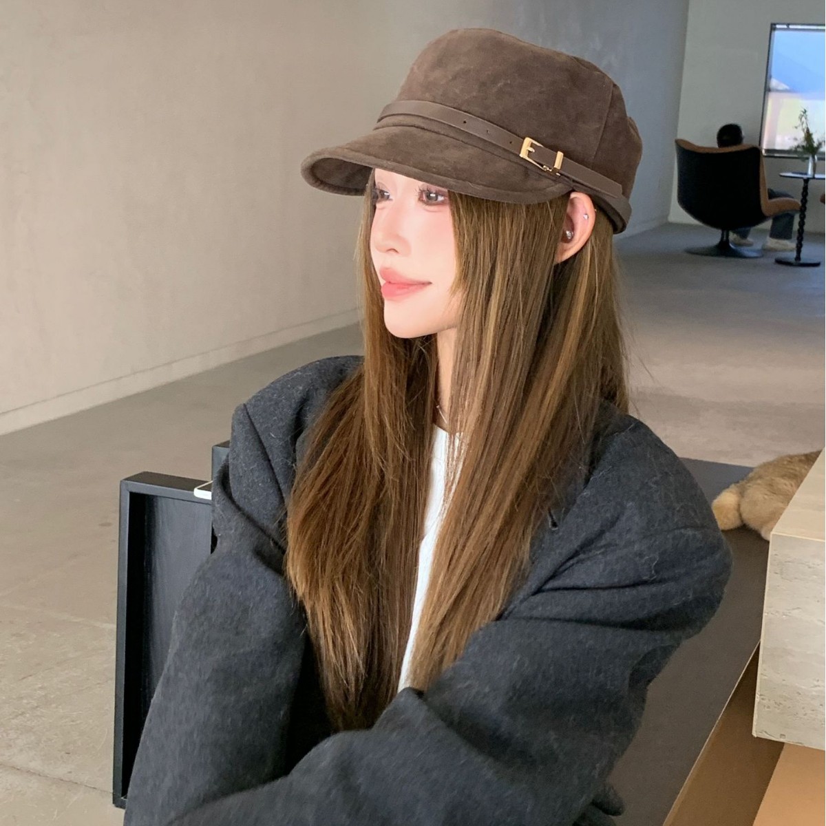 秋冬时尚皮带扣麂皮绒平顶帽女小众设计网红百搭鸭舌帽气质马术帽