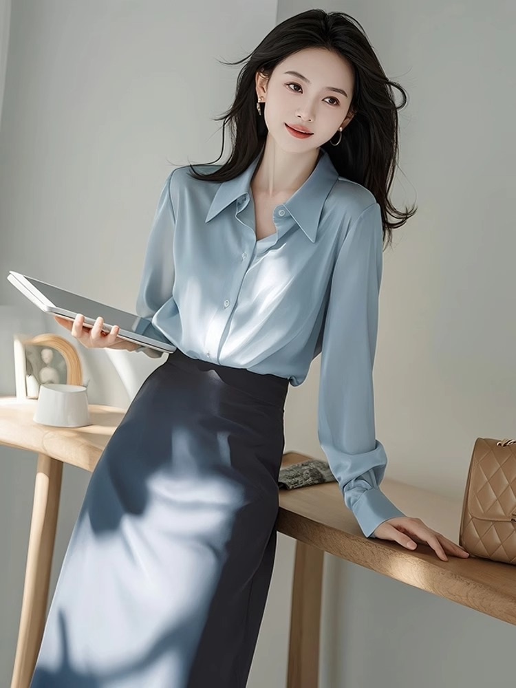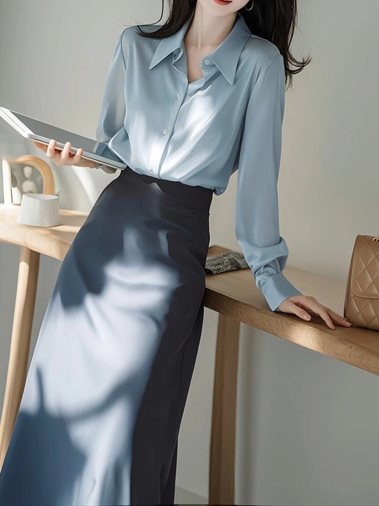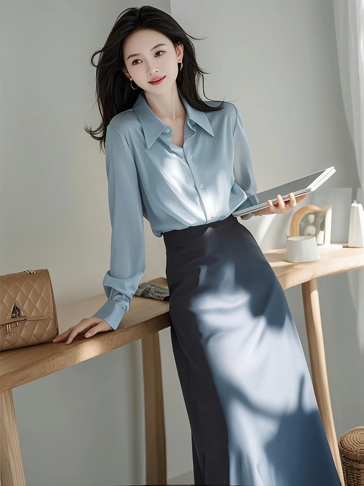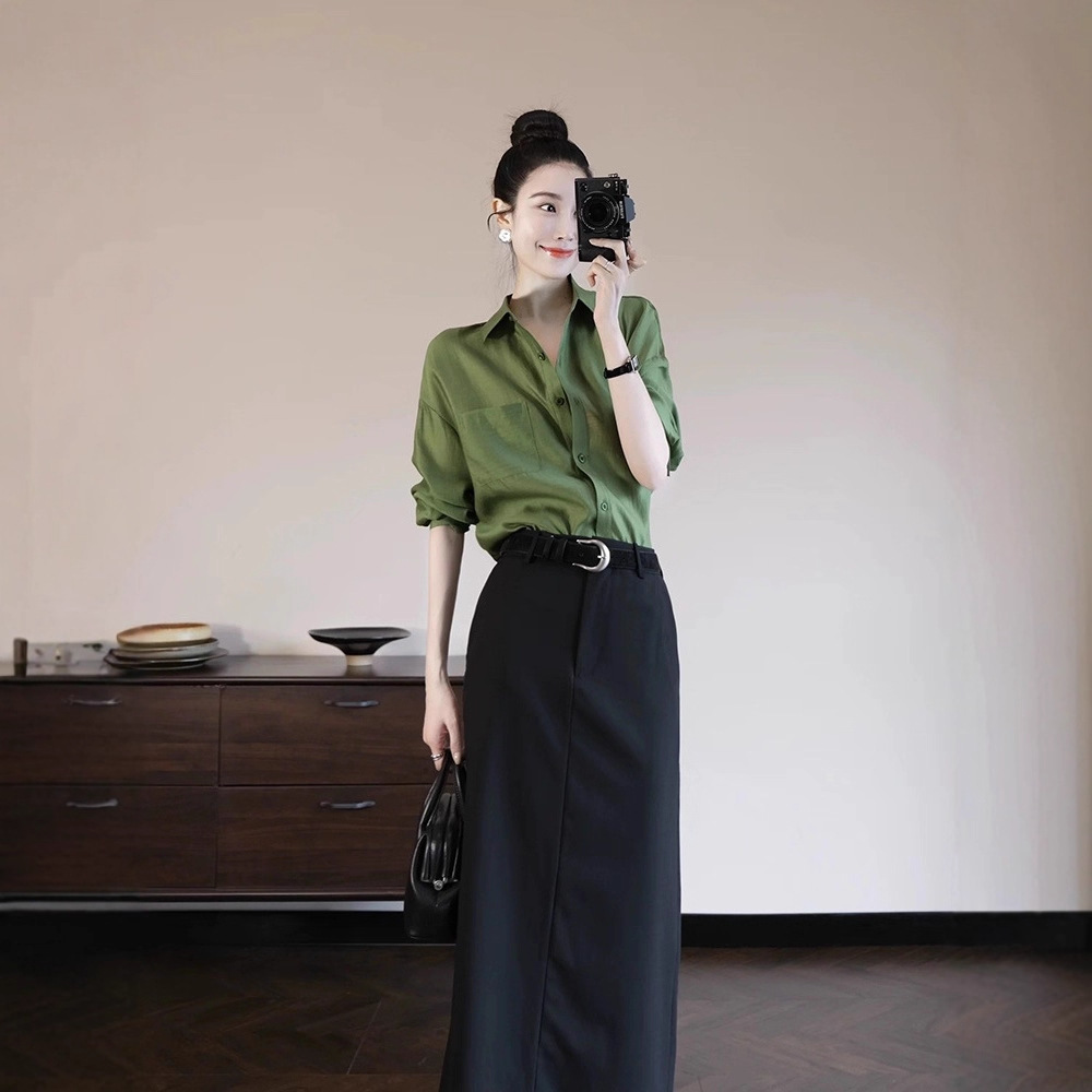 秋装气质一整套高级感轻奢减龄洋气绿色长袖衬衫半身裙职业套装女