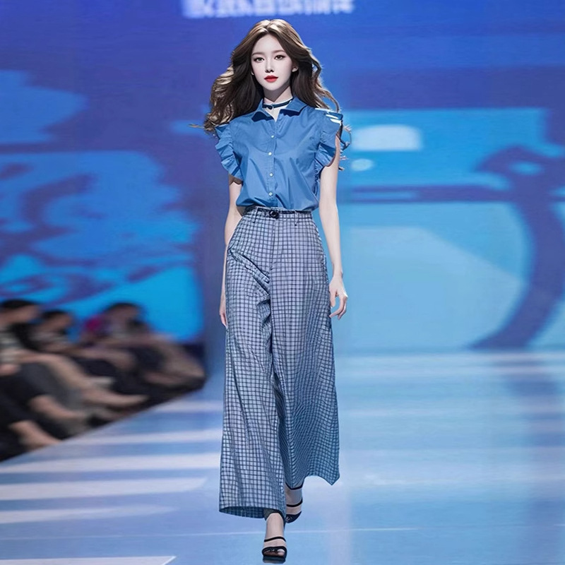 2025新型夏ネット赤揚げ街減齢ファッションのたるみ感は青い飛袖シャツの2セットを着ている
