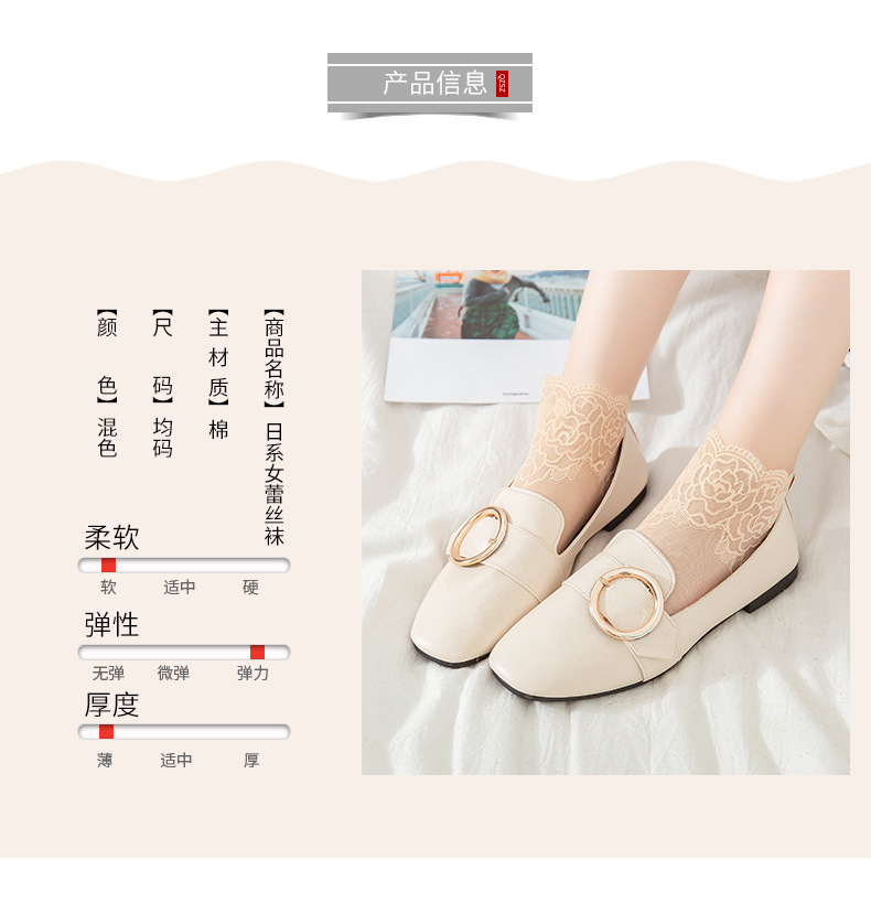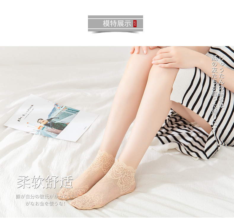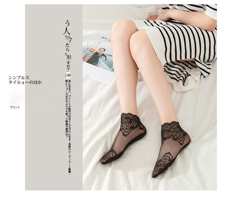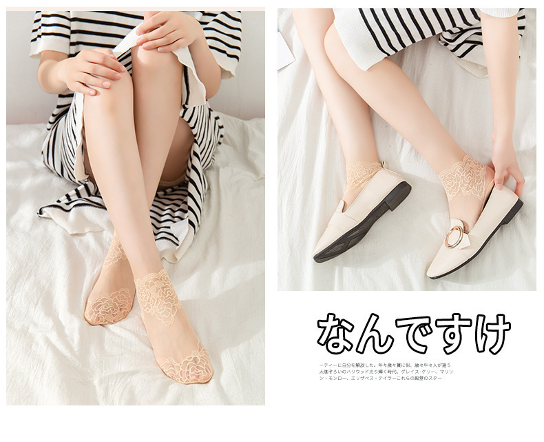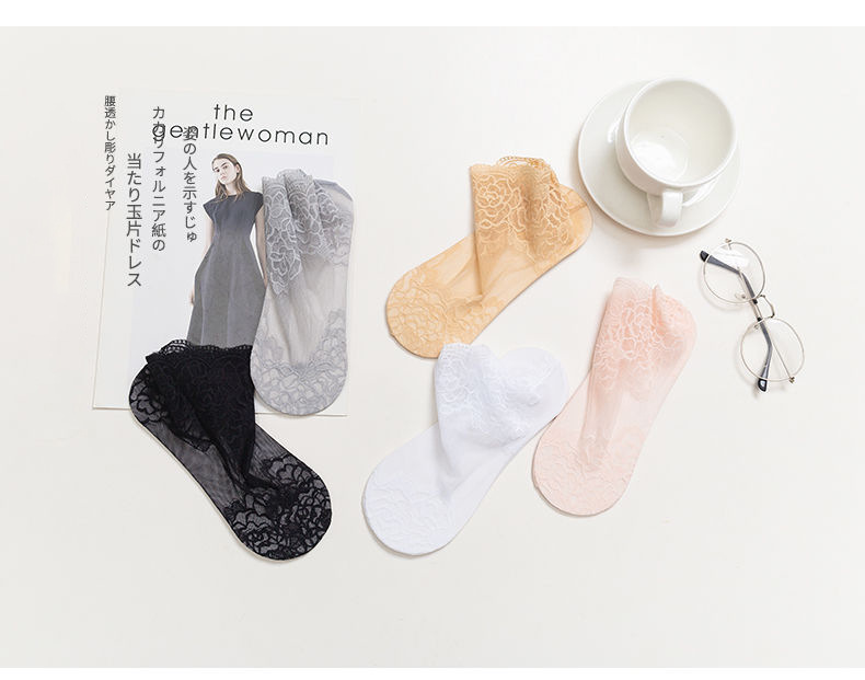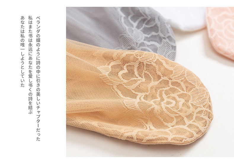 靴下の女性の夏の薄いレースの縁の靴下の綿の底の女性の靴下の中の筒の靴下は透かしを開けて通気性の滑り止めのネットの糸の靴下のカバーを滑ります。