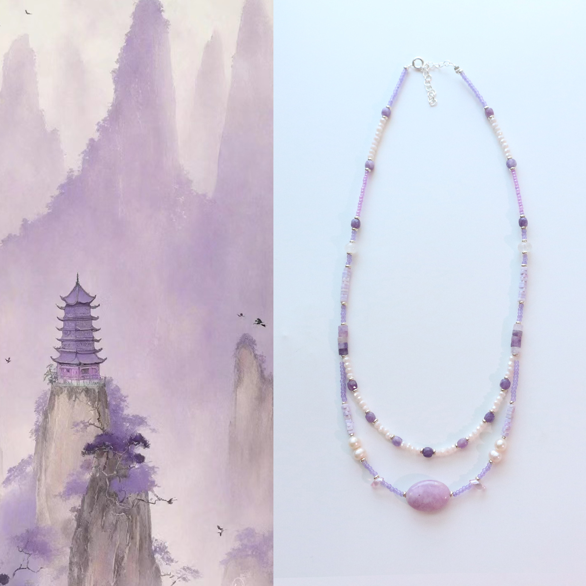 紫色の天然石ネックレス手作りビーズネックレス真珠二重国風清新小衆毛衣鎖鎖鎖
