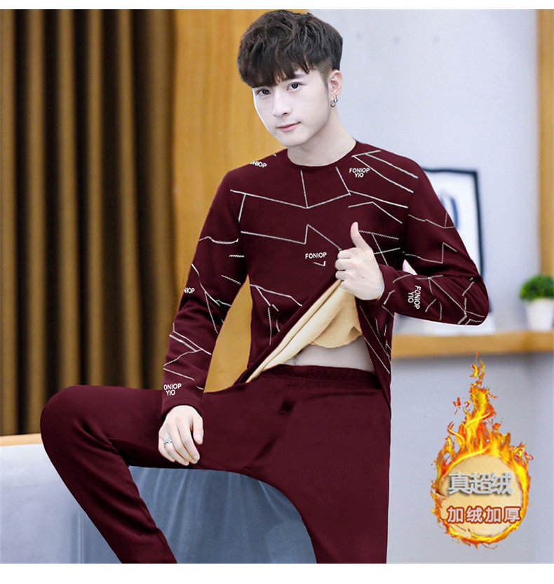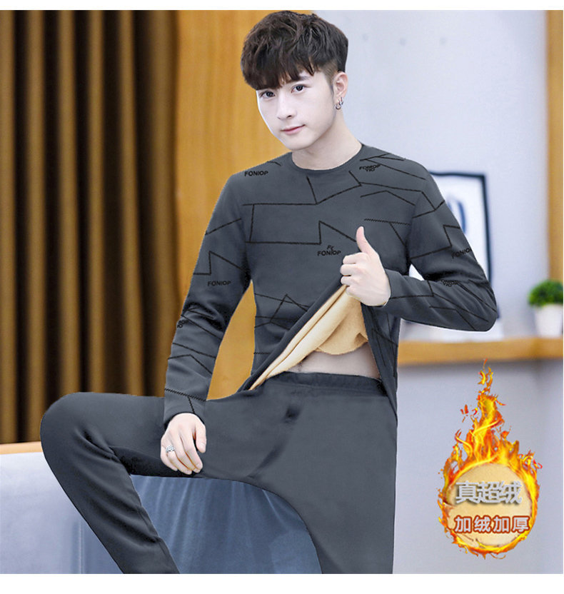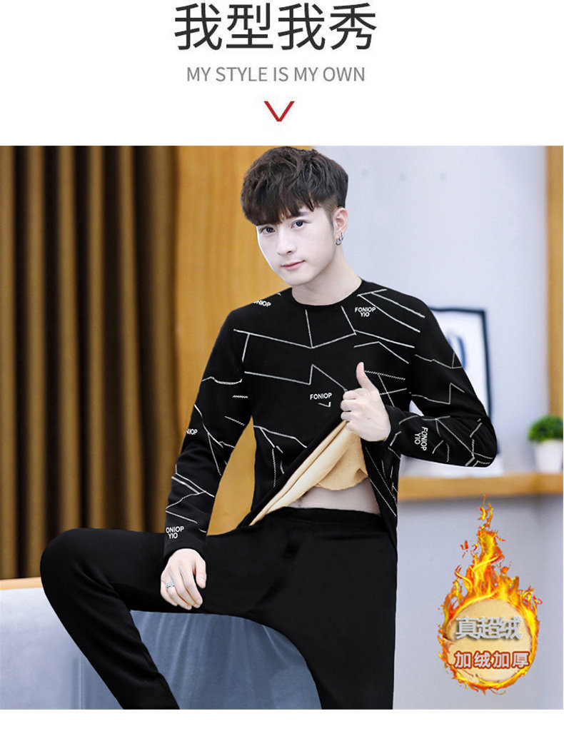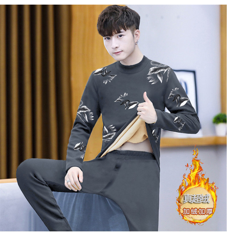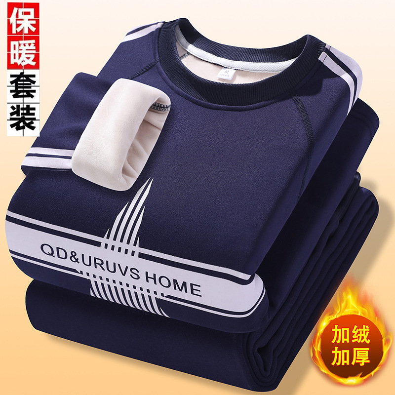 保温下着セット男性冬のベルベットは防寒青少年ファッション学生の2つのセットを厚くして丸襟を着る