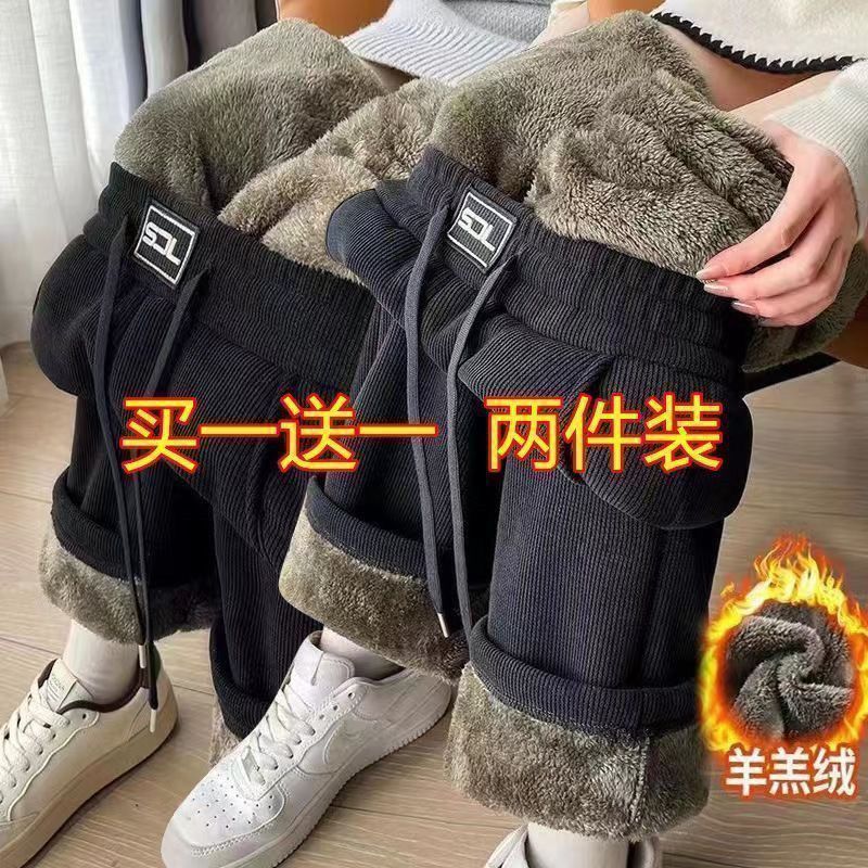冬款裤子男加绒加厚休闲韩版直筒裤高腰保暖阔腿裤
