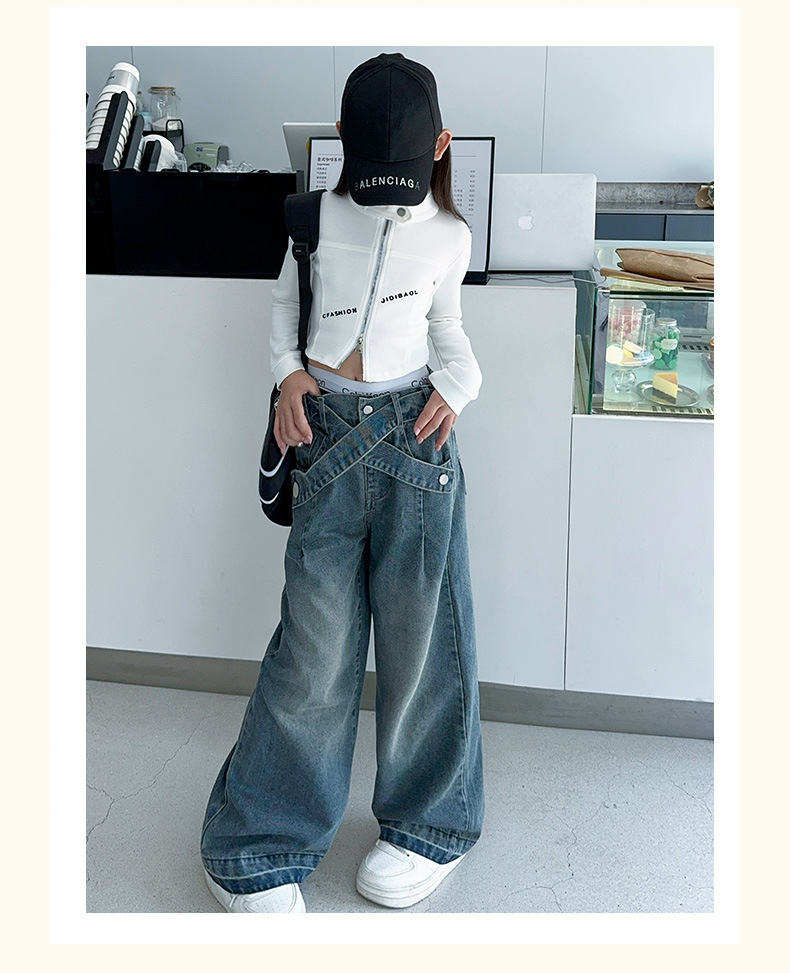 女の子の秋冬のジーパン2023新型のファッションの女の子の中で大きい子供の韓系は簡単に一体のベルベットの広い足のズボンを詰めます。